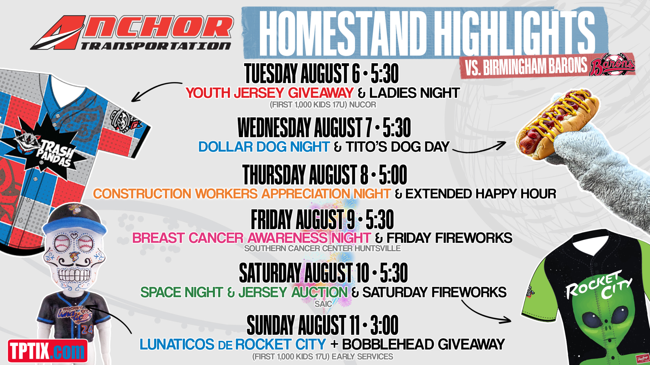 MADISON, Alabama – The Rocket City Trash Pandas will host the Birmingham Barons for the final time during the 2024 regular season. The details for each game and Specialty Food Items are listed below. Tuesday, August 6 - Youth Jersey Giveaway: The first 1,000 kids (ages 17 and under) will