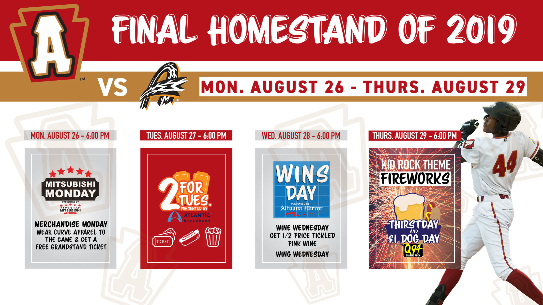 CURVE, Pa. - The Altoona Curve, Double-A affiliate of the Pittsburgh Pirates, play their last four home games of the 2019 season beginning on Monday, August 26.