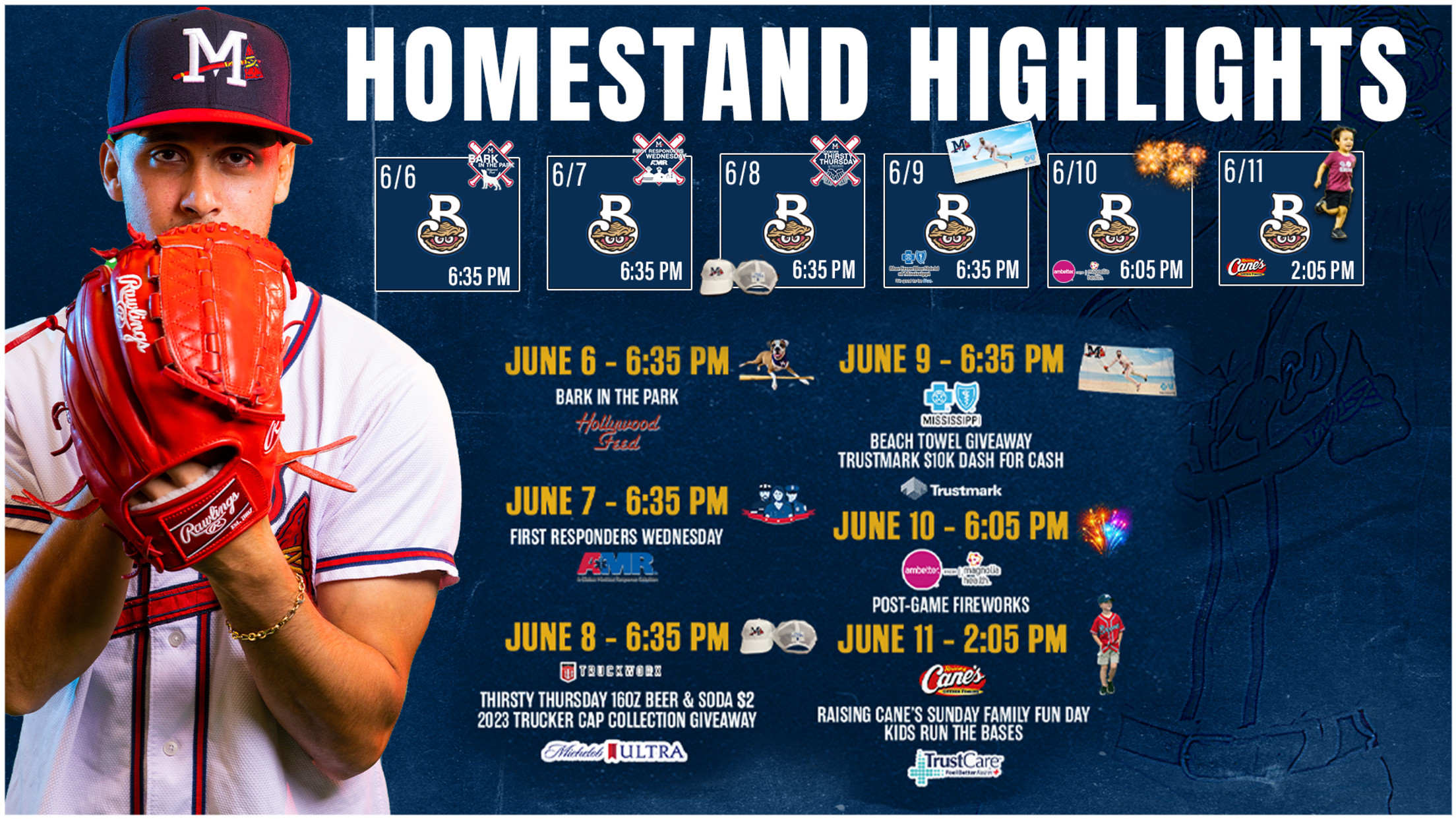 PEARL, MS – The Mississippi Braves begin a six-game home series tomorrow, June 6 at 6:35 pm against the Biloxi Shuckers (Double-A Affiliate, Milwaukee Brewers). The homestand features great promotions, including Thirsty Thursday Collection Michelob Ultra/M-Braves Trucker Caps, a Beach Towel Giveaway, and Saturday Postgame Fireworks! Tuesday, June 6 |
