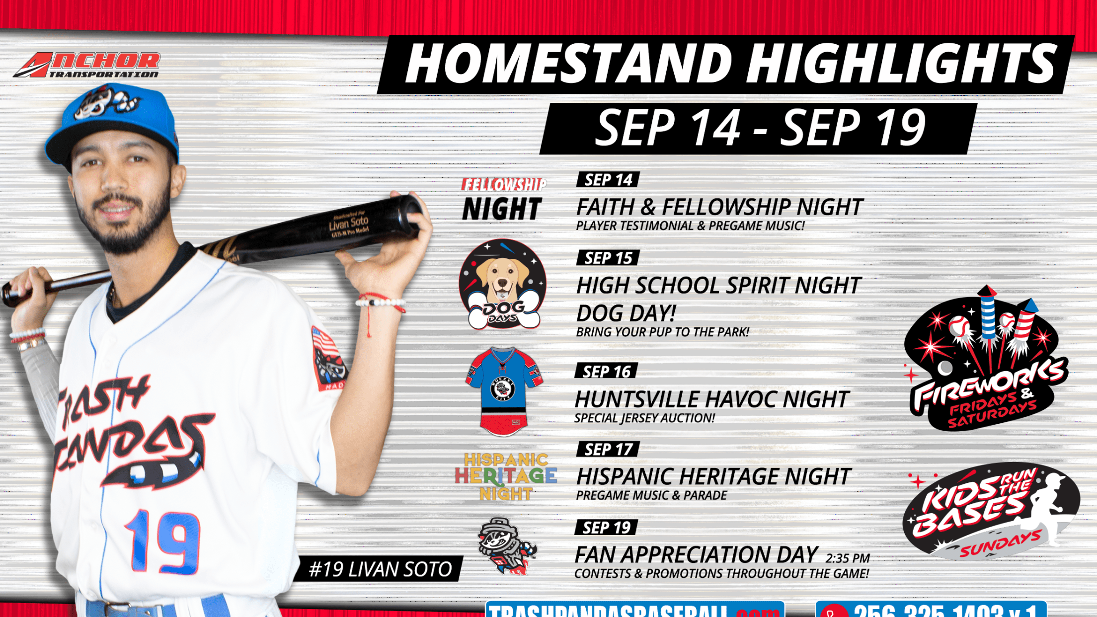 The last regular season homestand features Faith and Fellowship Night, High School Spirit Night, Huntsville Havoc Night with a Jersey Auction, and two fireworks shows before Fan Appreciation Day for the season finale.