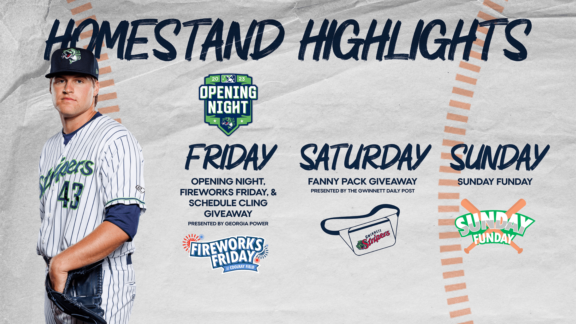 The Stripers’ only three-game homestand of the season kicks off on Friday with Opening Night presented by Georgia Power and will be capped with an extravagant exhibition of Friday Fireworks. The series continues with the first Giveaway Saturday (Clear Fanny Packs presented by Gwinnett Daily Post) and the first Sunday Funday matinee game.