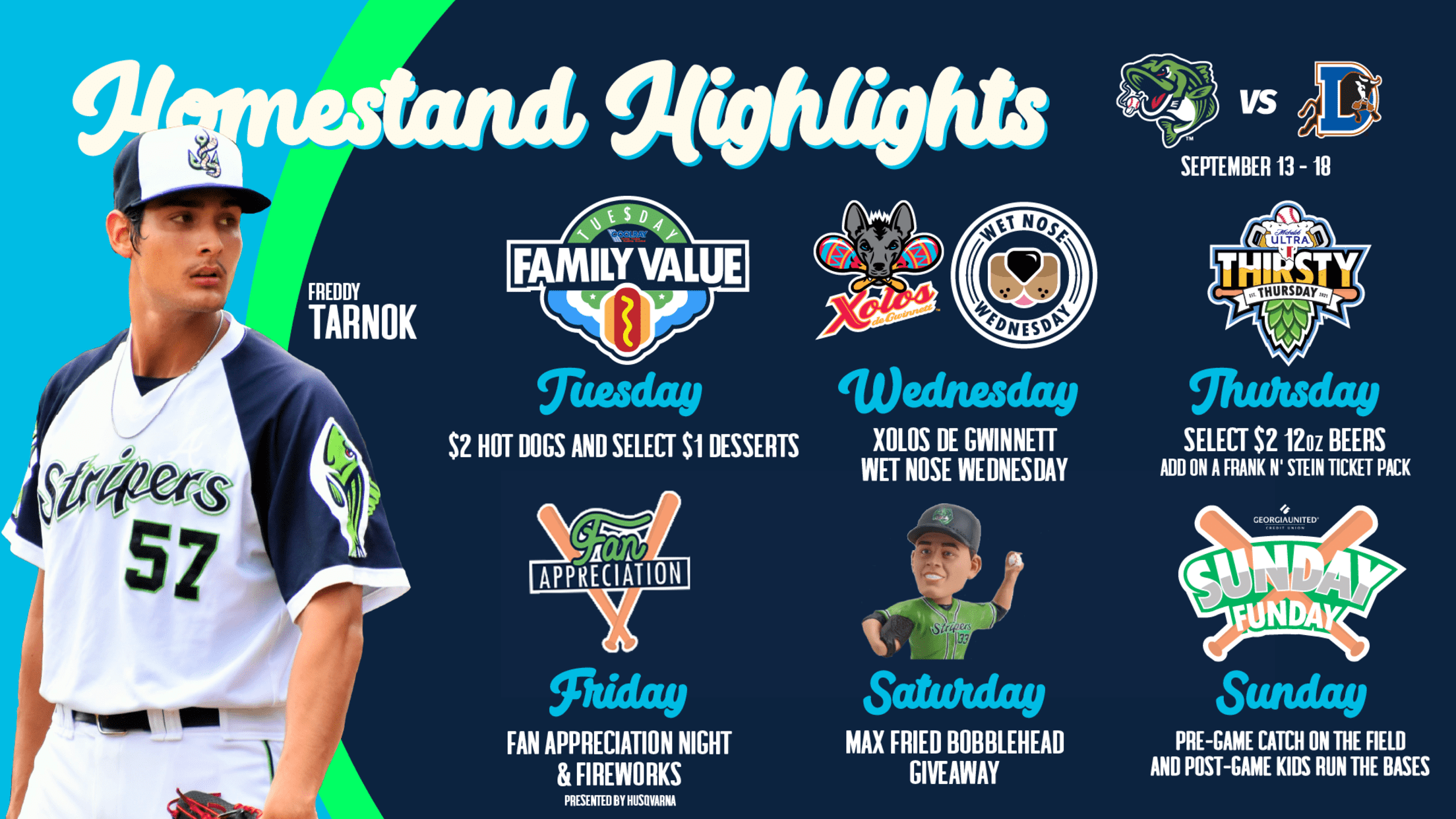 LAWRENCEVILLE, Ga. – The Gwinnett Stripers will give away 2,500 Max Fried Bobbleheads and shoot the last fireworks show of the season during a six-game series against the Durham Bulls (Tampa Bay Rays) at Coolray Field from September 13 to 18. Here’s a full look at the homestand: