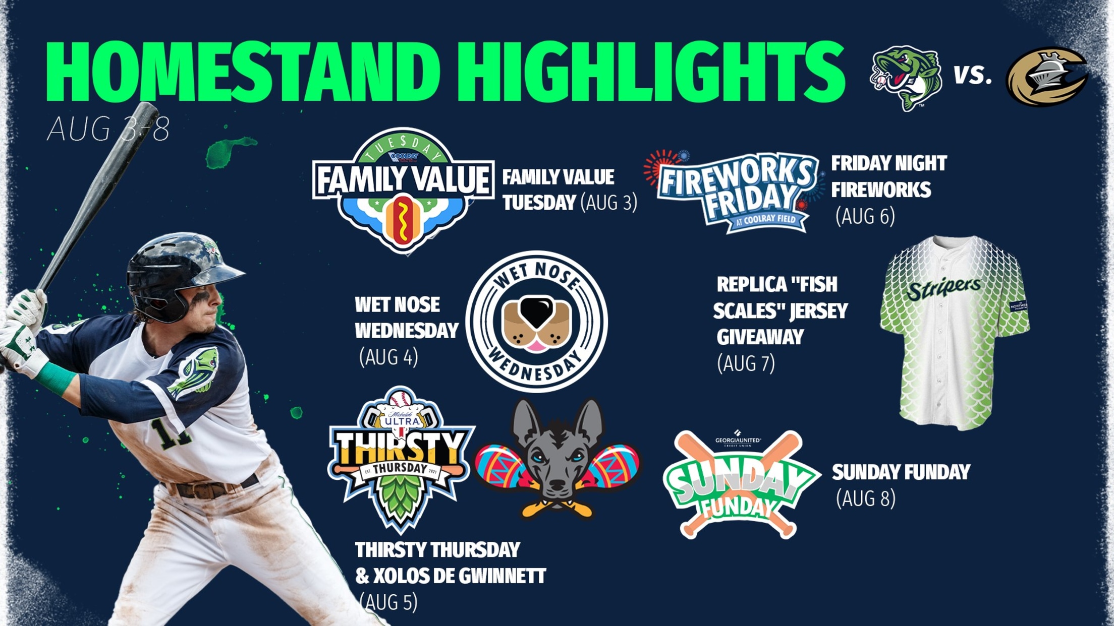 Xolos de Gwinnett: The Stripers will transform into the Xolos de Gwinnett, honoring the culture and traditions of Gwinnett County’s Hispanic and Latino communities for MiLB’s Copa de la Diversión.