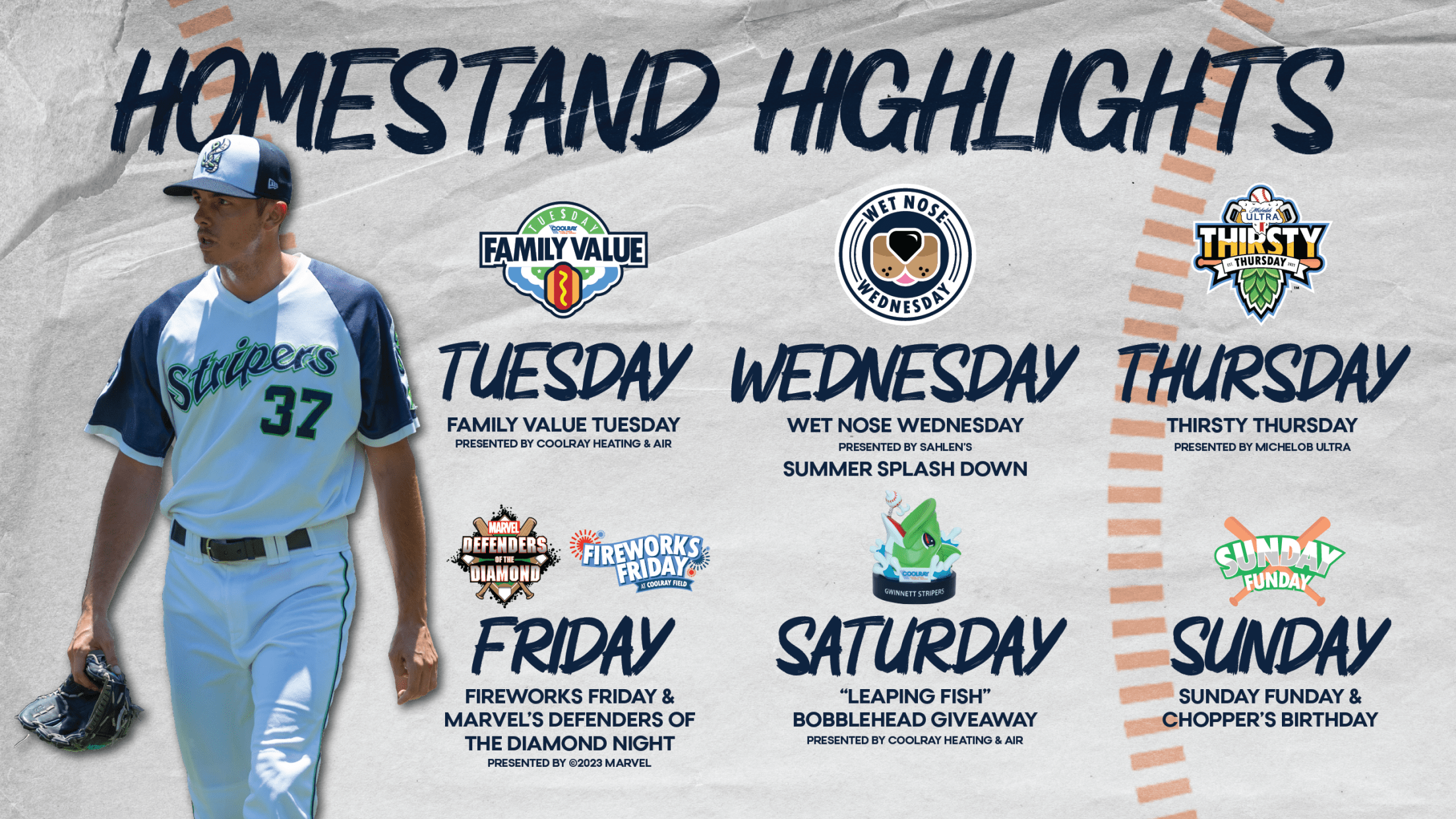 LAWRENCEVILLE, Ga. – The Gwinnett Stripers will join the world's greatest heroes, give away a one-of-a-kind bobblehead modeled off the team’s distinctive jumping fish logo, and celebrate the birthday of their beloved mascot Chopper as they host the Norfolk Tides in a six-game series at Coolray Field from July 18-23.
