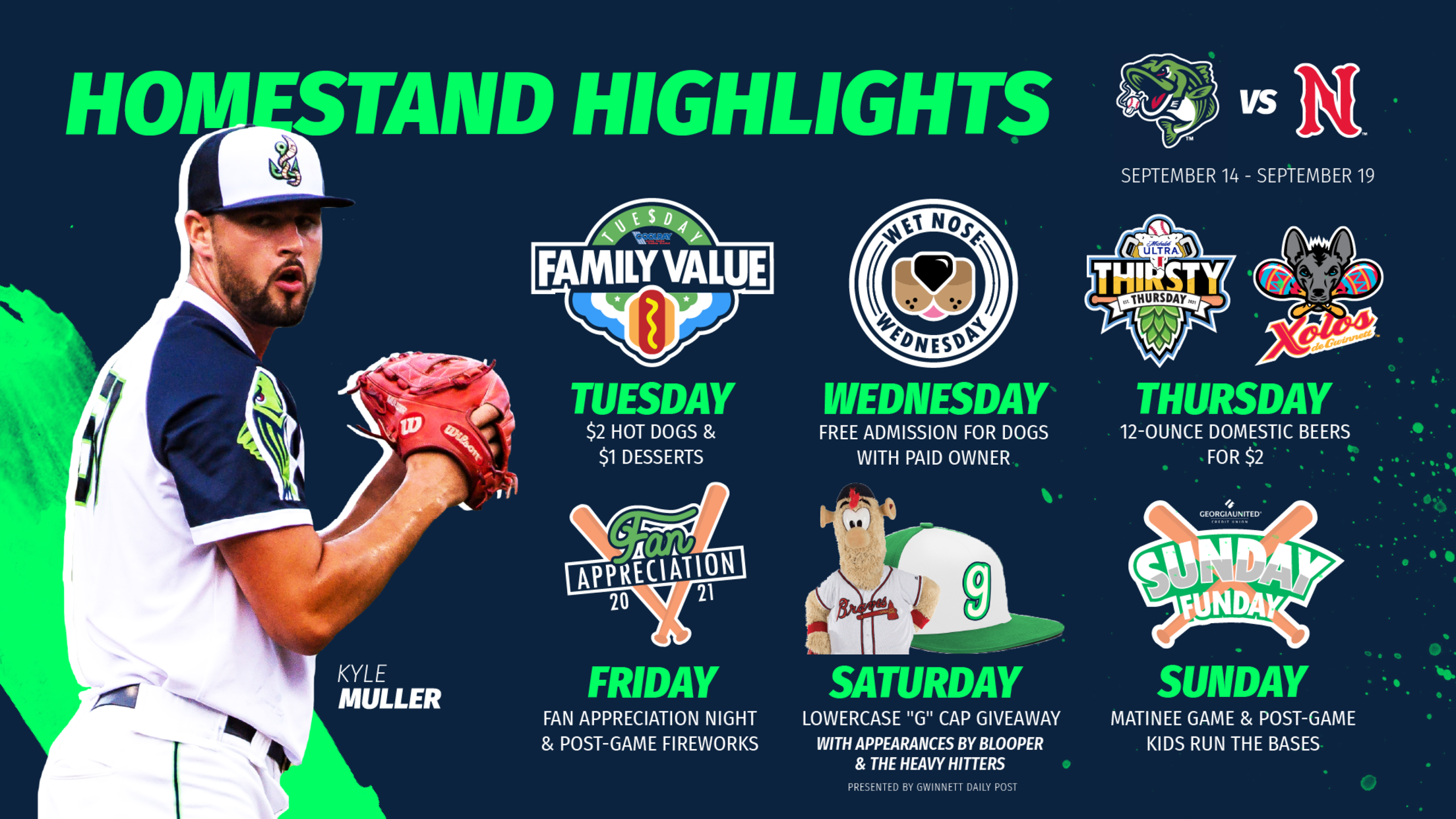 LAWRENCEVILLE, Ga. – The Gwinnett Stripers host the Nashville Sounds at Coolray Field for a six-game series from September 14 to September 19. The homestand includes Fan Appreciation Night and Fireworks Friday (September 17), and a retro-style Lowercase “g” Cap Giveaway (September 18). Here’s a full look at the homestand:
