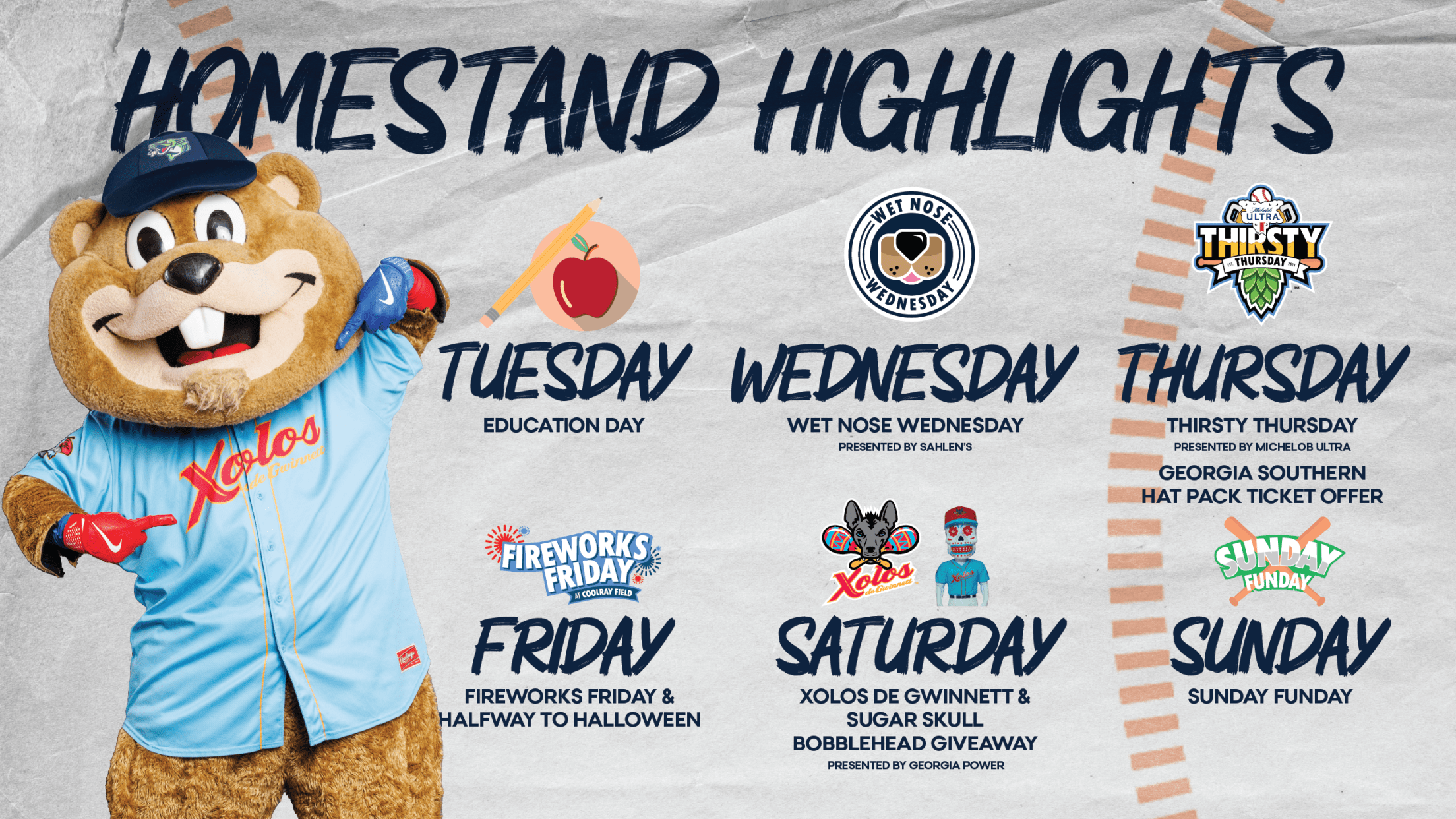 The homestand once again kicks off with a special Tuesday matinee game for Education Day, continues with a Georgia Southern Hat Pack special on Michelob Ultra Thirsty Thursday, and features the first Xolos Sugar Skull Bobblehead Giveaway (presented by Georgia Power) on Saturday.