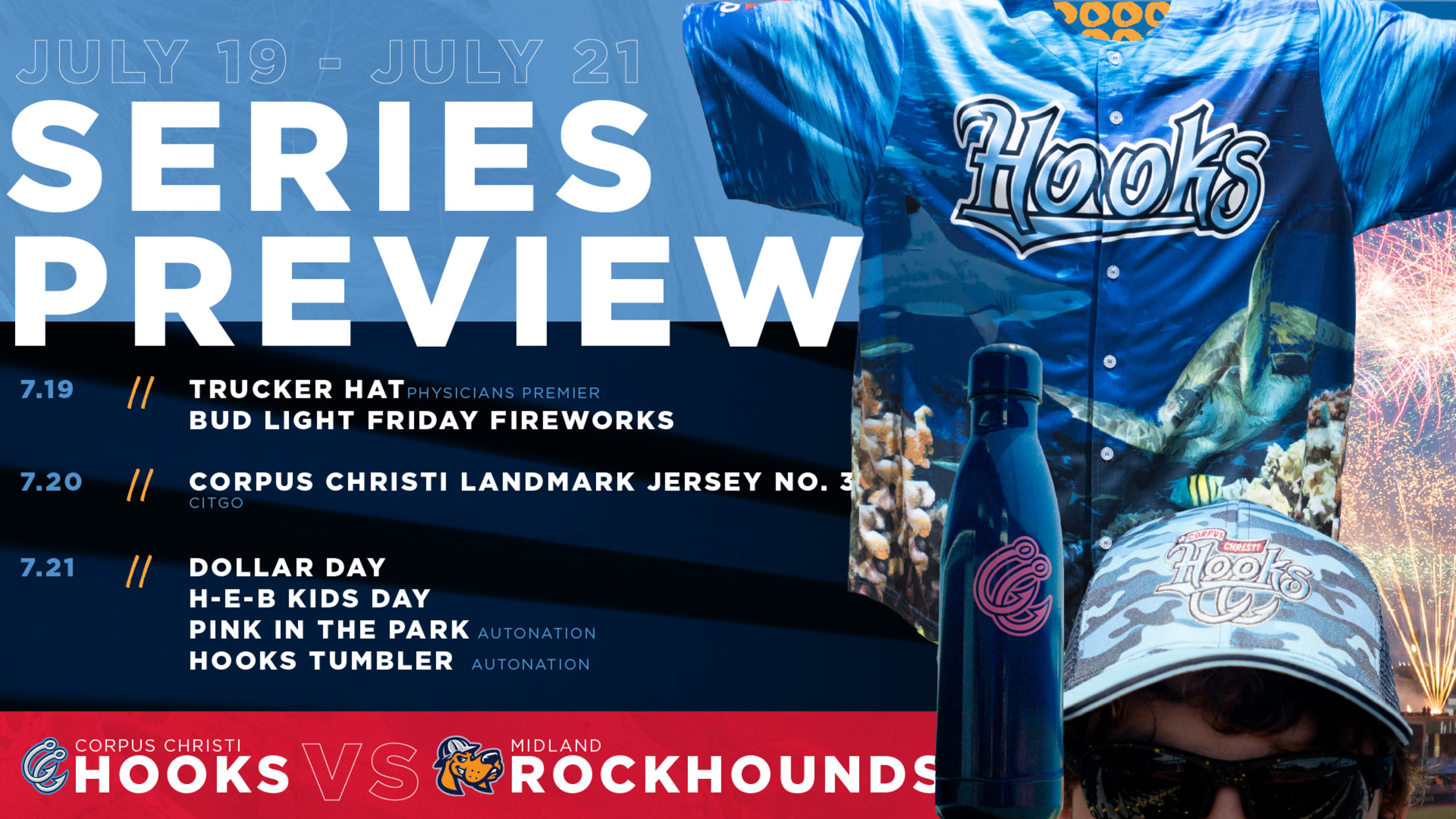 CORPUS CHRISTI – Your Corpus Christi Hooks return to Whataburger Field on Friday night to start a three-game stand vs. the Midland RockHounds. Bud Light Friday Fireworks and Hooks Trucker Hats from Physicians Premier lead off the action. Saturday, July 20, fans take home Corpus Christi Landmark Jersey No. 3,