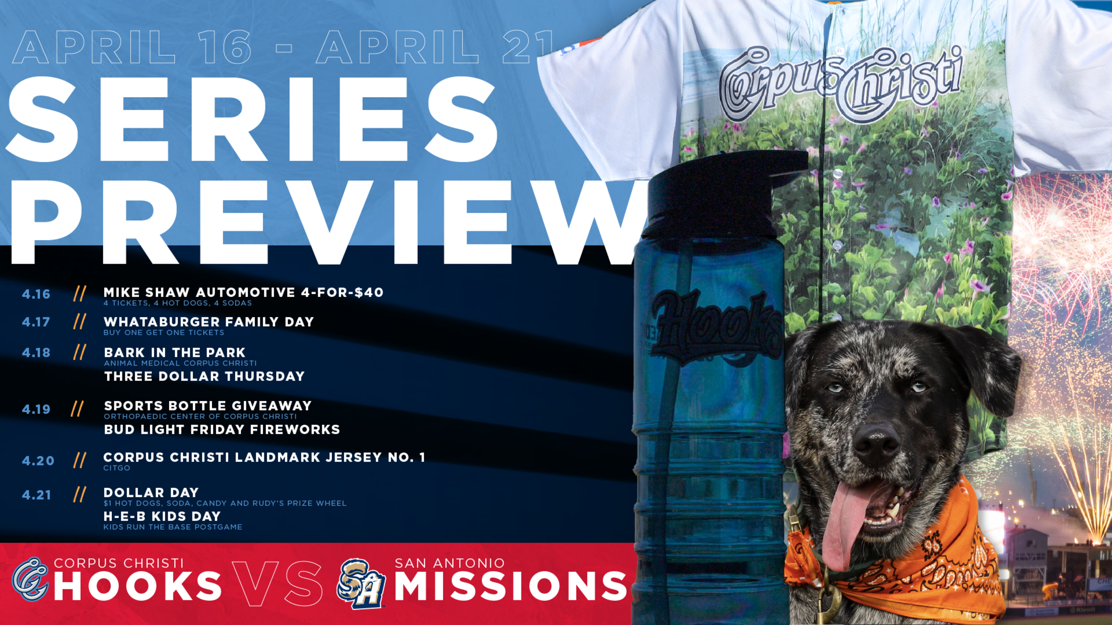 CORPUS CHRISTI – Your Corpus Christi Hooks play host to the San Antonio Missions, Double-A affiliate of the San Diego Padres, in a six-game series Tuesday, April 16 through Sunday, April 21 at Whataburger Field.