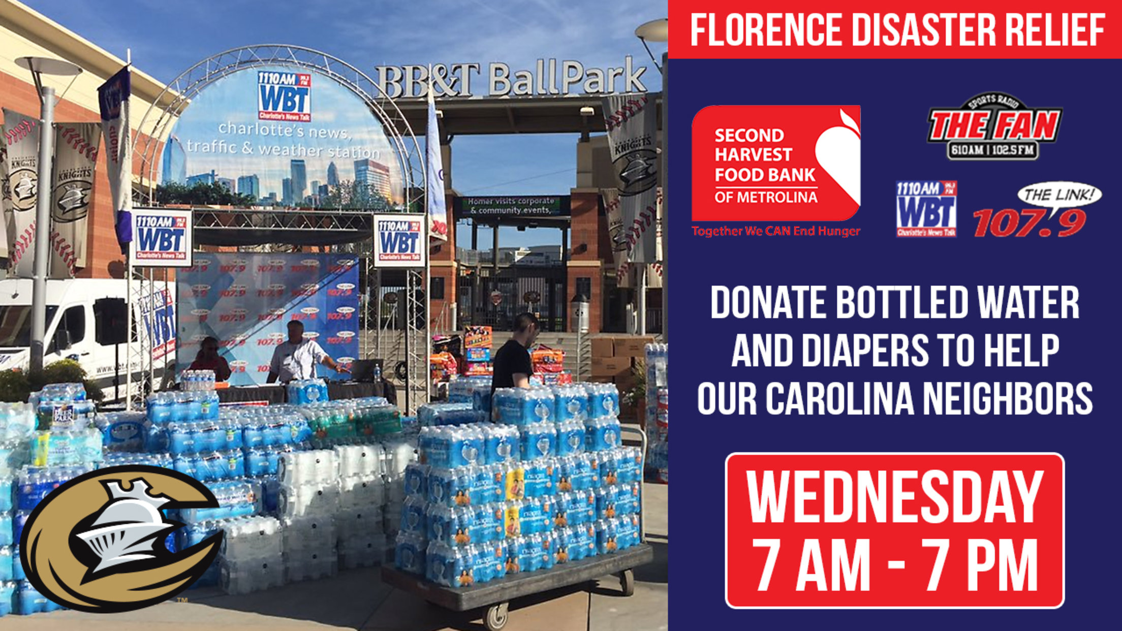 (UPTOWN CHARLOTTE, NC) -- On Wednesday, September 26th from 7:00 a.m. to 7:00 p.m., the Charlotte Knights and Entercom Charlotte will collect cases of bottled water and boxes of diapers at BB&T Ballpark for those impacted in North Carolina and South Carolina by Hurricane Florence. The entire collection drive will