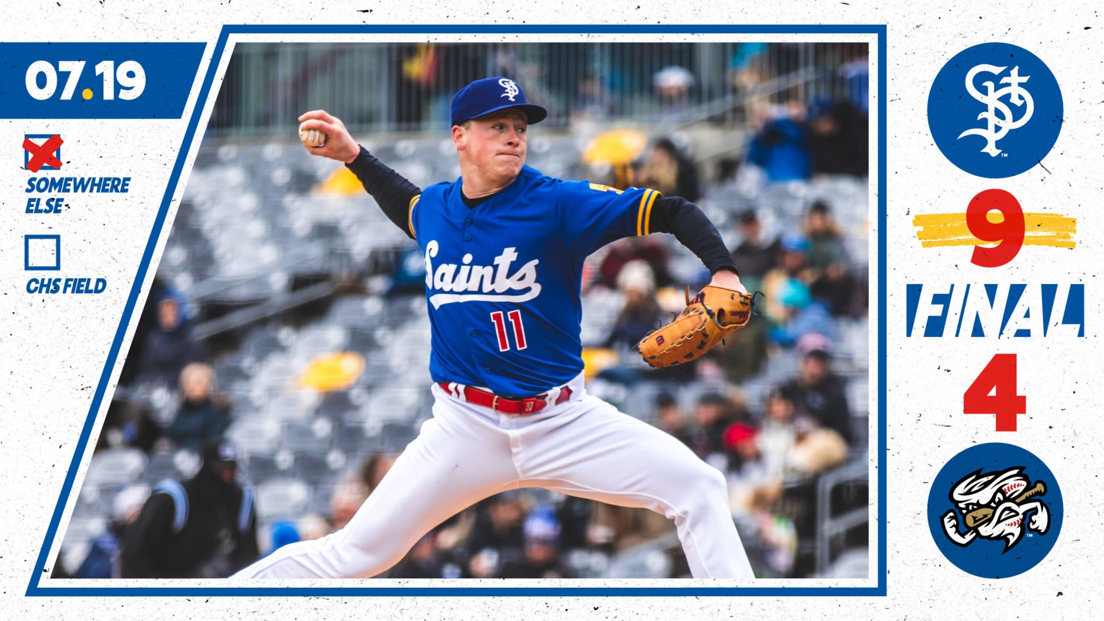 _PAPILLION, NE _*(July 19, 2023) - *The hit by pitches will hurt a little less. The St. Paul Saints were plunked by a franchise record five pitches, they drew 11 walks, including three with the bases loaded, utilizing all of it for a 9-4 victory over the Omaha Storm Chasers on Wednesday night at Werner Park. The win improves the Saints to 11-6 in the second half.