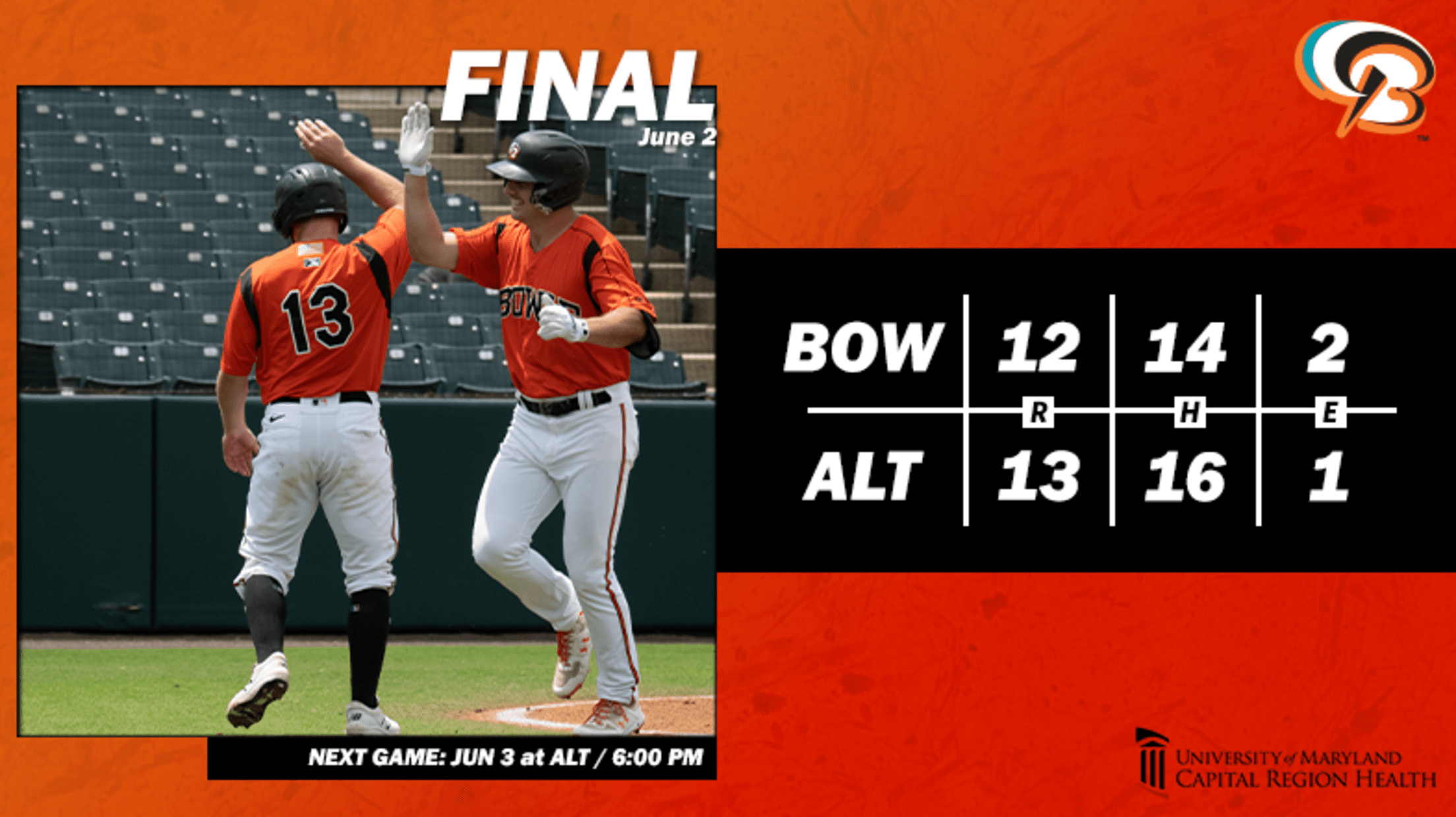 The loss knocks Bowie down to an 18-28 record, as their four-game winning streak ends. The two sides will continue their six-game series on Friday, with the fourth game of the set scheduled to start at 6:00 p.m.