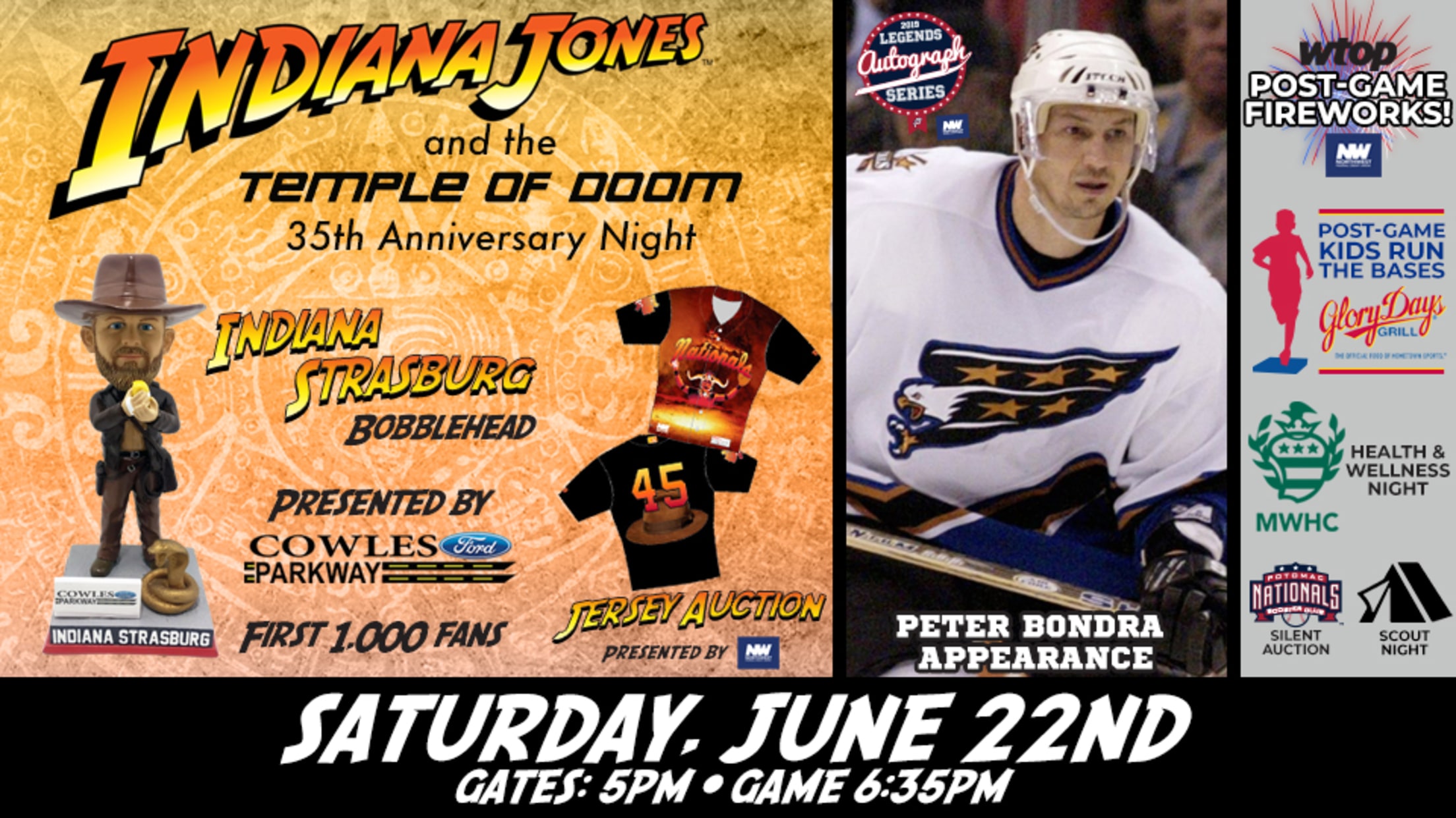 Woodbridge, VA---The Potomac Nationals have a jam-packed night planned on Saturday, June 22nd as they take on the Carolina Mudcats (Milwaukee Brewers) at Northwest Federal Field at Pfitzner Stadium. A celebration of Indiana Jones and the Temple of Doom's 35th anniversary will be accompanied by post-game fireworks, special themed promotions, and an appearance by Washington Capitals legend Peter Bondra for a meet-and-greet and autograph signing.