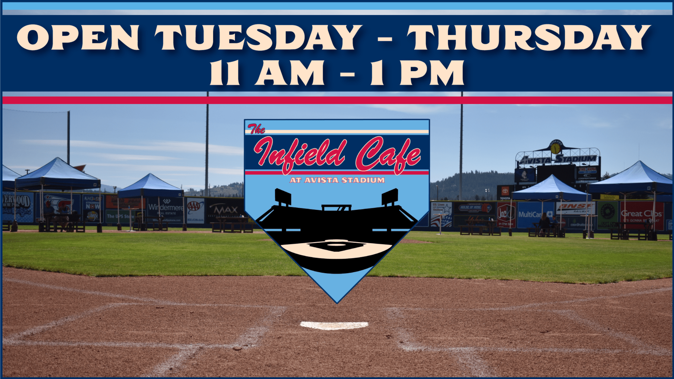 Spokane, Wash. - The Infield Cafe at Avista Stadium will continue into August with updated hours. Summer heat is not an issue at this patio favorite with shaded tables and sprinklers running in the outfield. New cafe hours are Tuesday through Thursday from 11AM - 1PM and closed Monday and Friday.