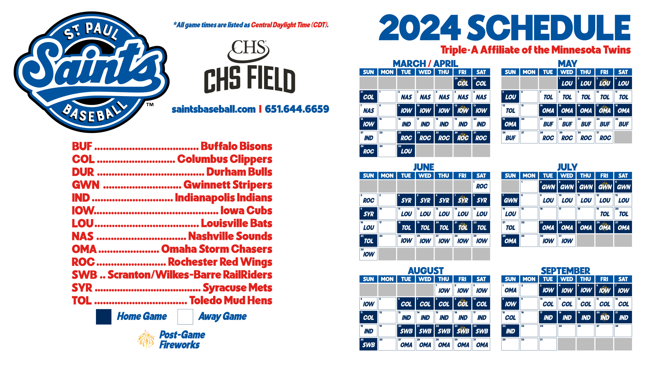 The Saints will play only one first-time opponent in 2024, the Syracuse Mets (New York Mets), who will come to CHS Field from June 4-9. Over the last two seasons, the Saints have hosted the Nashville Sounds (Milwaukee Brewers), but for the first time in the franchise’s history, they will travel to First Horizon Park from April 2-7.