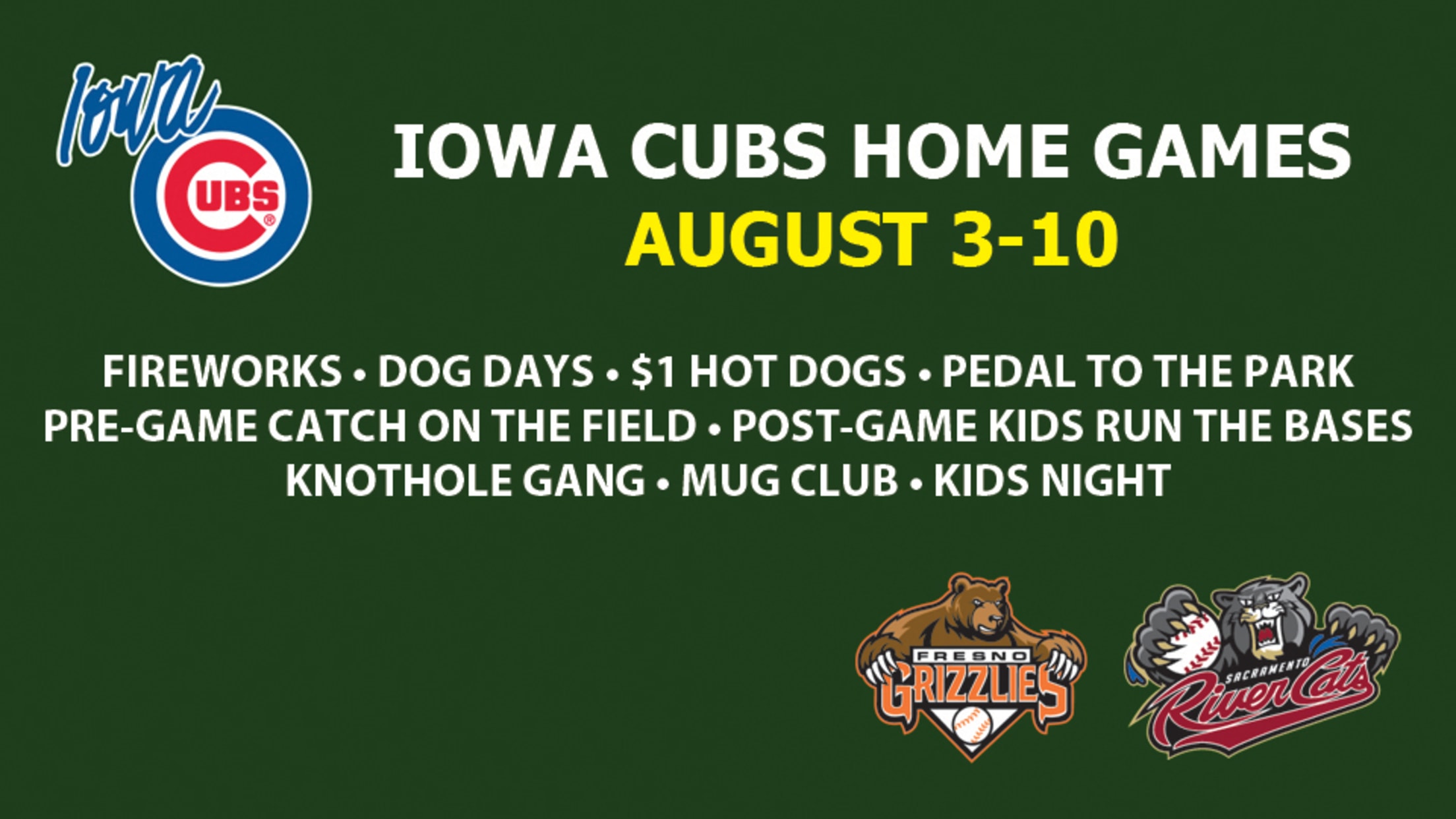 The Iowa Cubs are home for eight games, August 3-10, and you're sure to have a dog-gone good time. There's Dog Days, Dollar Dogs, fireworks, Pedal to the Park and more!