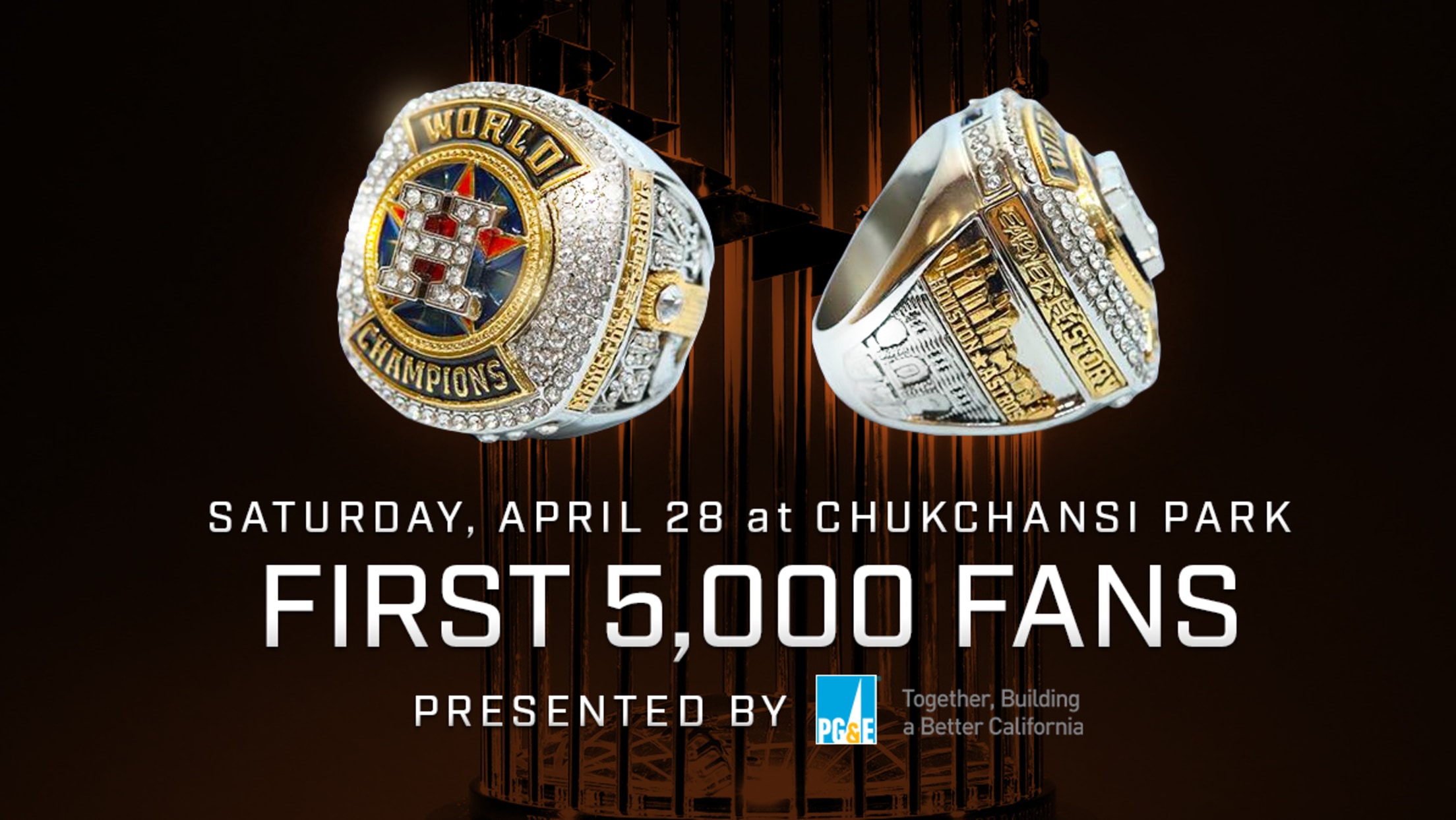 Saturday, April 28 (7:05 p.m.) - Houston Astros World Champion Replica Ring Giveaway, presented by PG&E: As you may have heard, four of the last eight World Series Champions have been "Farm Grown" in Fresno, dating back to 2010. Once again we get to give away replica championship rings, so be early, as the first 5,000 fans through the gates will take home this one-of-a-kind collectible replica of the Houston Astros' title bling.
