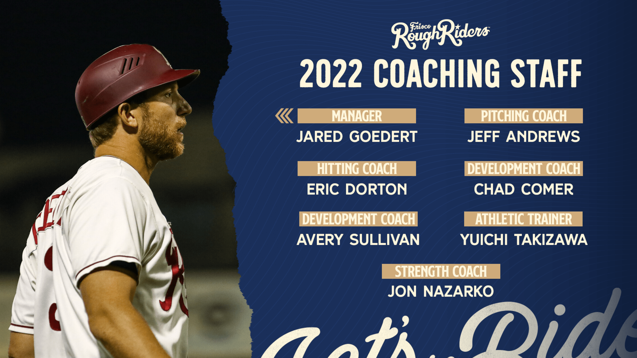 FRISCO, Texas (January 10, 2021) - The Frisco RoughRiders, in conjunction with the Texas Rangers, have announced manager Jared Goedert will return to the RoughRiders for the 2022 season. Goedert will be joined by Jeff Andrews (pitching coach), Eric Dorton (hitting coach) and Chad Comer and Avery Sullivan (developmental coaches). Yuichi Takizawa (athletic trainer) and Jon Nazarko (strength and conditioning coach) round out the Riders 2022 staff.