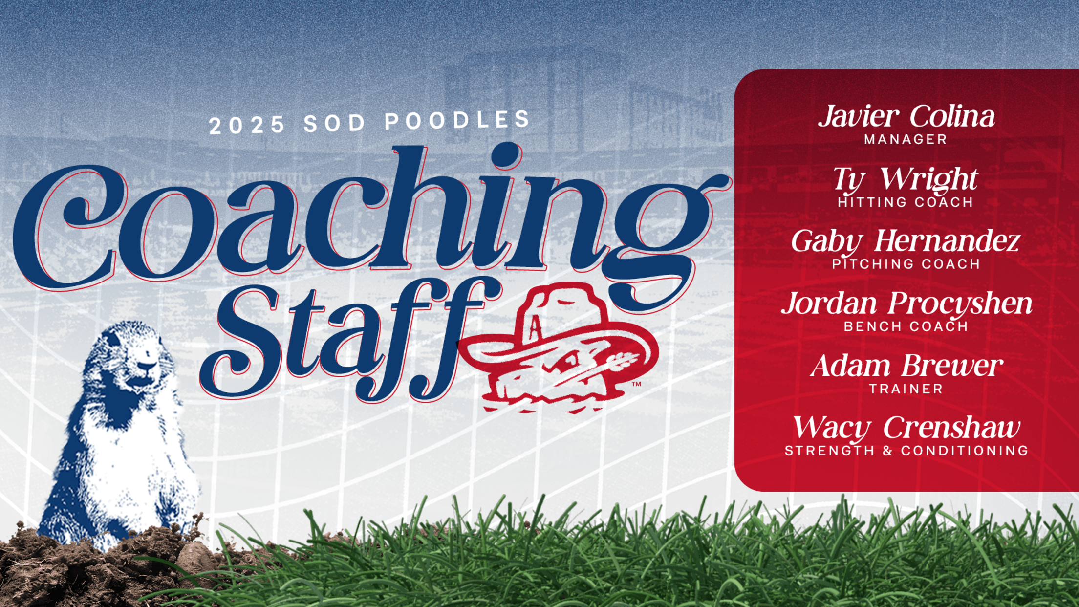 AMARILLO, Texas (January 14, 2025) – The Amarillo Sod Poodles, in partnership with the Arizona Diamondbacks, are thrilled to announce their on-field staff for the 2025 season. Javier Colina will return to Amarillo as the fourth manager in Sod Poodles franchise history. Alongside Colina is pitching coach Gaby Hernandez, hitting coach Ty Wright, bench coach Jordan Procyshen, athletic trainer Adam Brewer, and strength and conditioning coach Wacy Crenshaw.