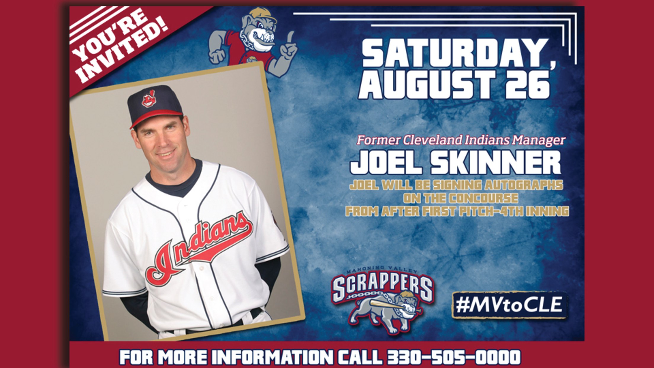 Join the Scrappers when former Cleveland Indians Manager Joel Skinner makes an appearance at Eastwood Field on Saturday, August 26 presented by Subway of Niles. He will throw out a first pitch and sign autographs for fans on the concourse from 7:05pm through the 4th inning. For more information call 330-505-0000
