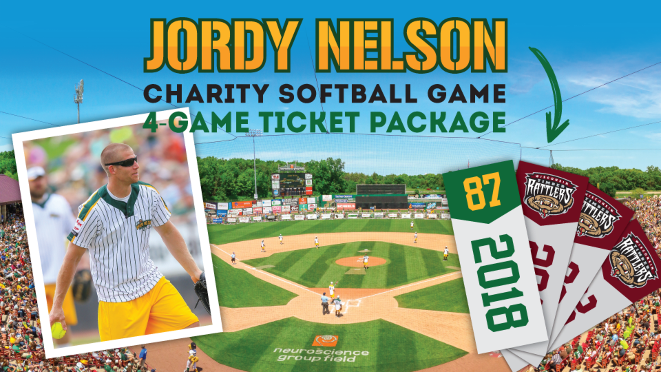 ORDER INDIVIDUAL TICKETS AT THIS LINK STARTING AT 10AM on 11/21GRAND CHUTE, WI - The 2018 Jordy Nelson Charity Softball Game will be held at Neuroscience Group Field at Fox Cities Stadium at 12:05pm on Saturday, June 2. Individual tickets for the game will go on sale Tuesday, November 21