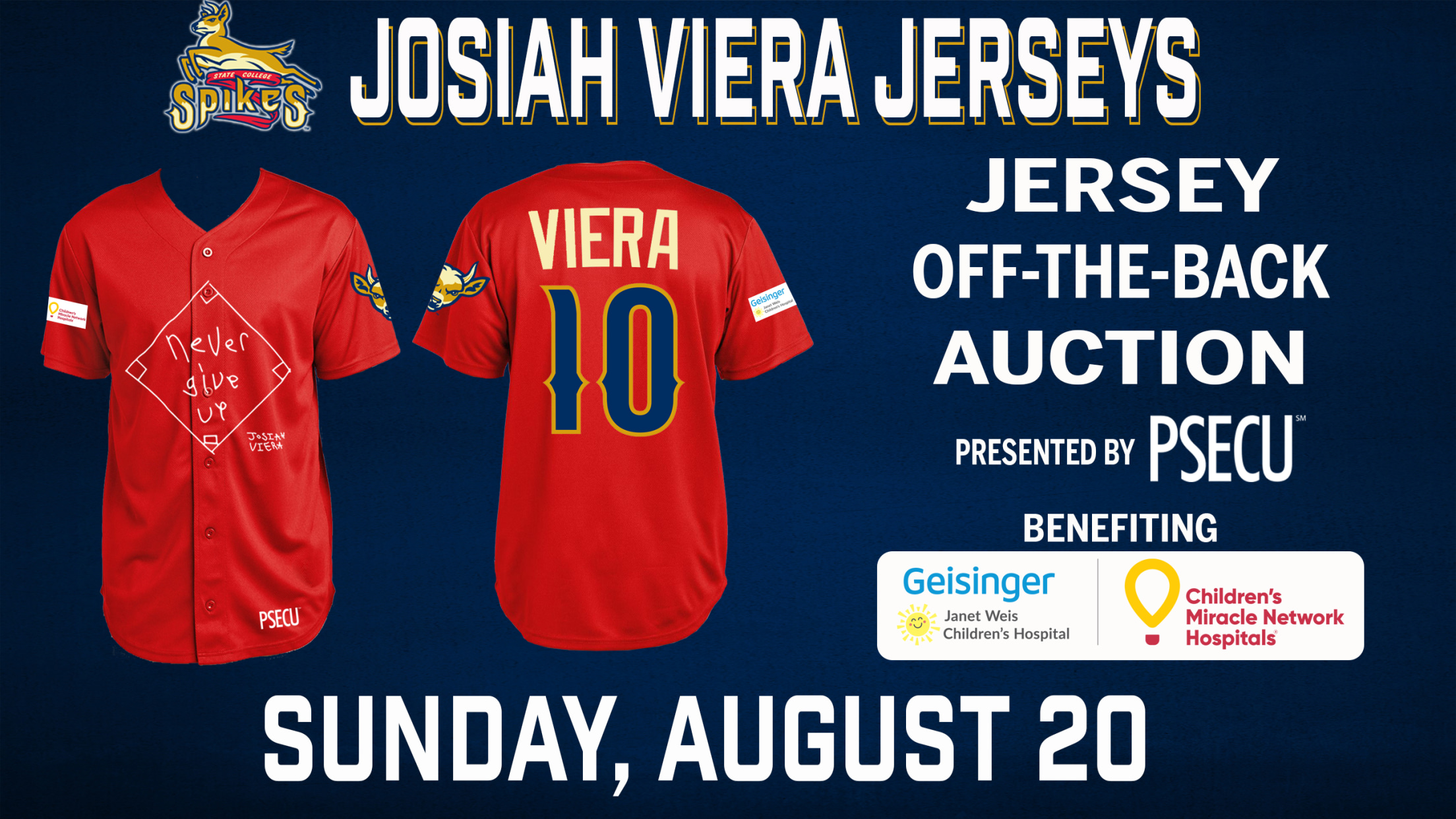 On what would have been his 19th birthday, all of us at the State College Spikes are honored to announce that on Sunday, August 20, our friend and teammate Josiah Viera will be featured on jerseys that will be worn by the entire team, which will go up for bids in a Jersey-off-the-Back Auction presented by PSECU to benefit Children’s Miracle Network, specifically the work done by CMN at Gesinger Janet Weis Children’s Hospital in Danville, which provided Josiah with outstanding care throughout his lifelong battle with progeria, a rapid aging condition.