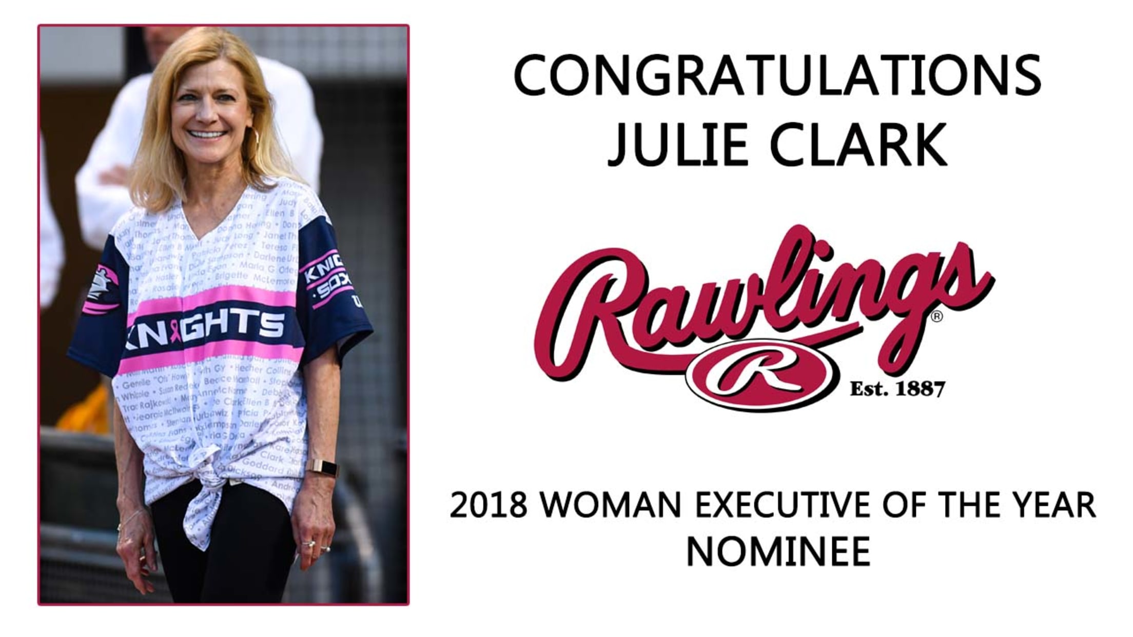 (UPTOWN CHARLOTTE, NC) -- The Charlotte Knights are thrilled to announce that Julie Clark, the team's Director of Special Projects, has been nominated by the International League for the 2018 Rawlings Woman Executive of the Year Award.