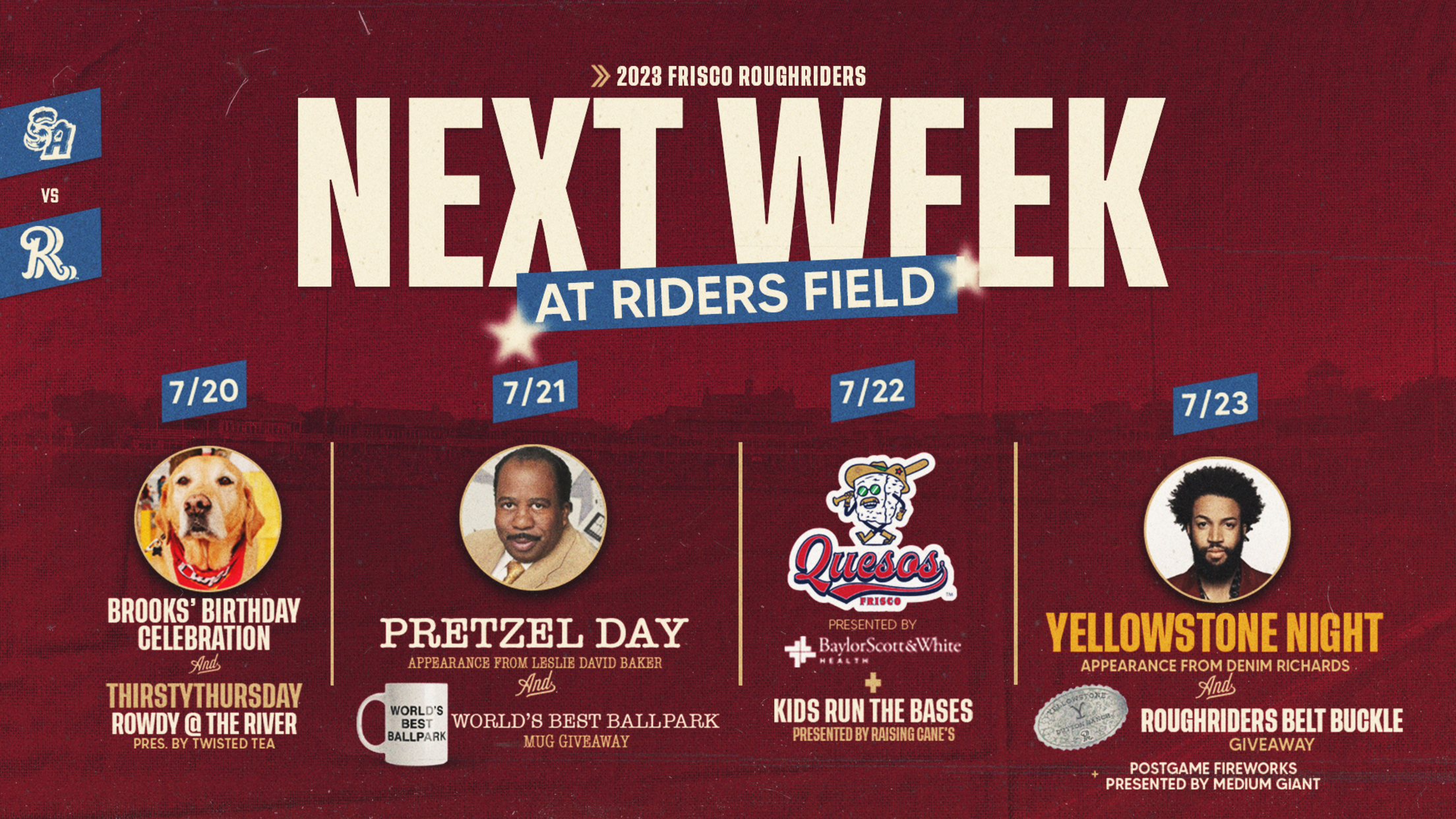 FRISCO, Texas (July 12, 2023) – The Frisco RoughRiders return to Riders Field from July 18-23rd for the first homestand after the All-Star break, featuring appearances from The Office's Leslie David Baker and Yellowstone's Denim Richards, during a series with the San Antonio Missions. Friday is Pretzel Day, including a