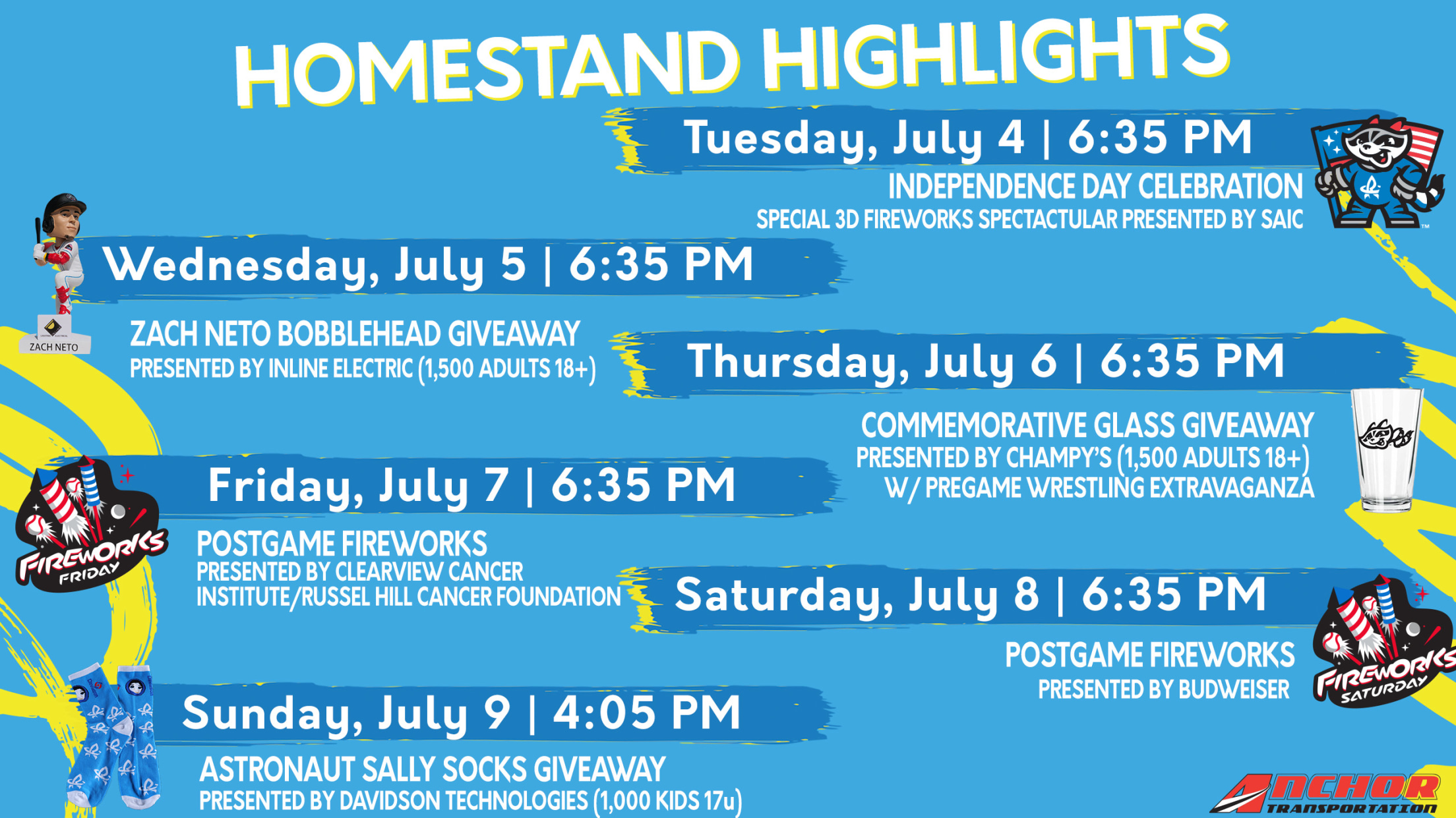 - Zach Neto Bobblehead Giveaway: 1,500 adults ages 18 and older will receive a limited edition bobblehead featuring former Trash Pandas infielder Zach Neto, presented by Inline Electric.