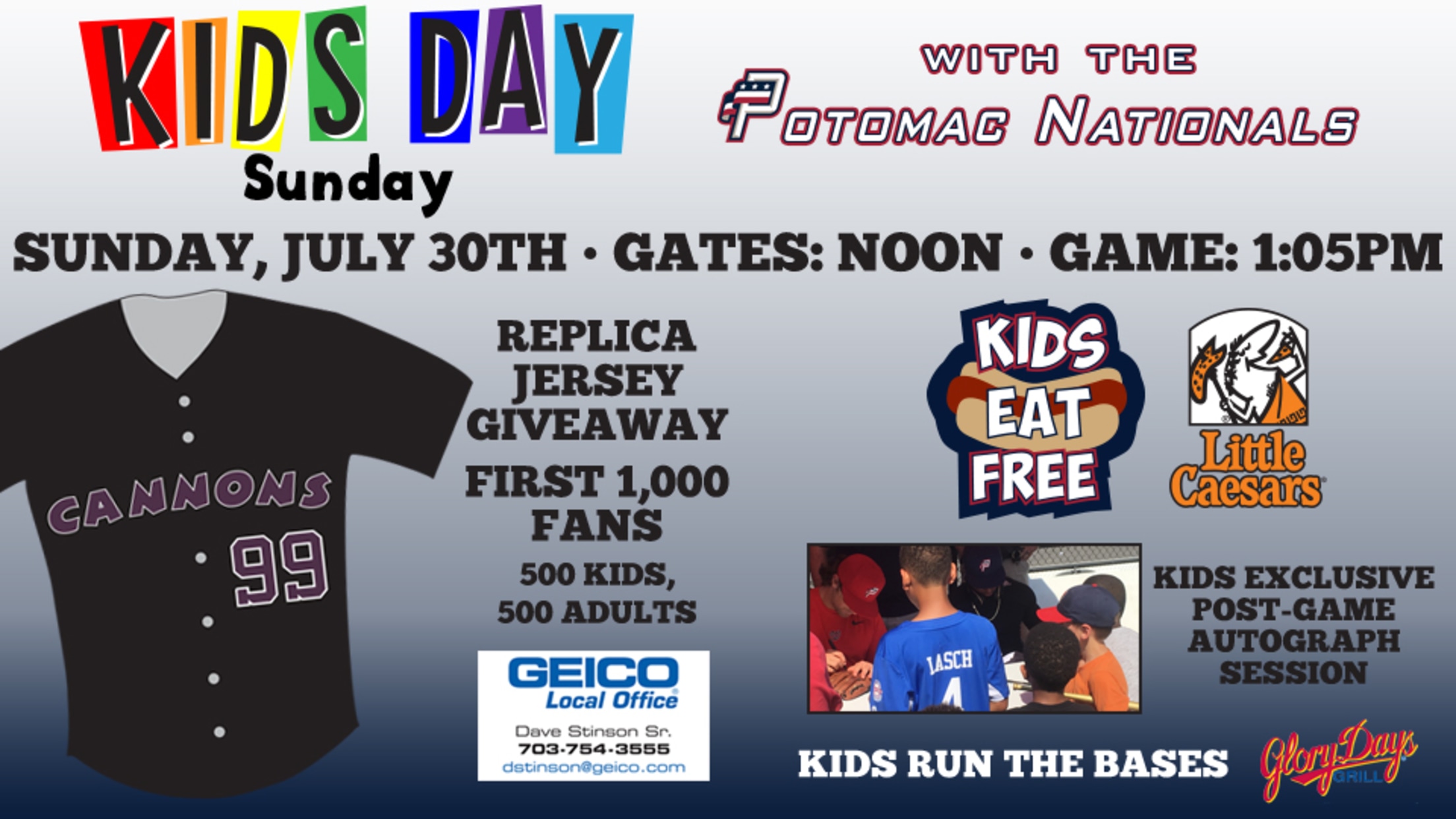 Woodbridge, VA---On Sunday, July 30th, the Potomac Nationals will give away a 1999 to 2004 Potomac Cannons Replica Throwback Jersey as part of another Kids Day Sunday with entertainment for the whole family at Pfitzner Stadium.The first 1,000 fans through the gates (500 kids aged 12 and under and 500