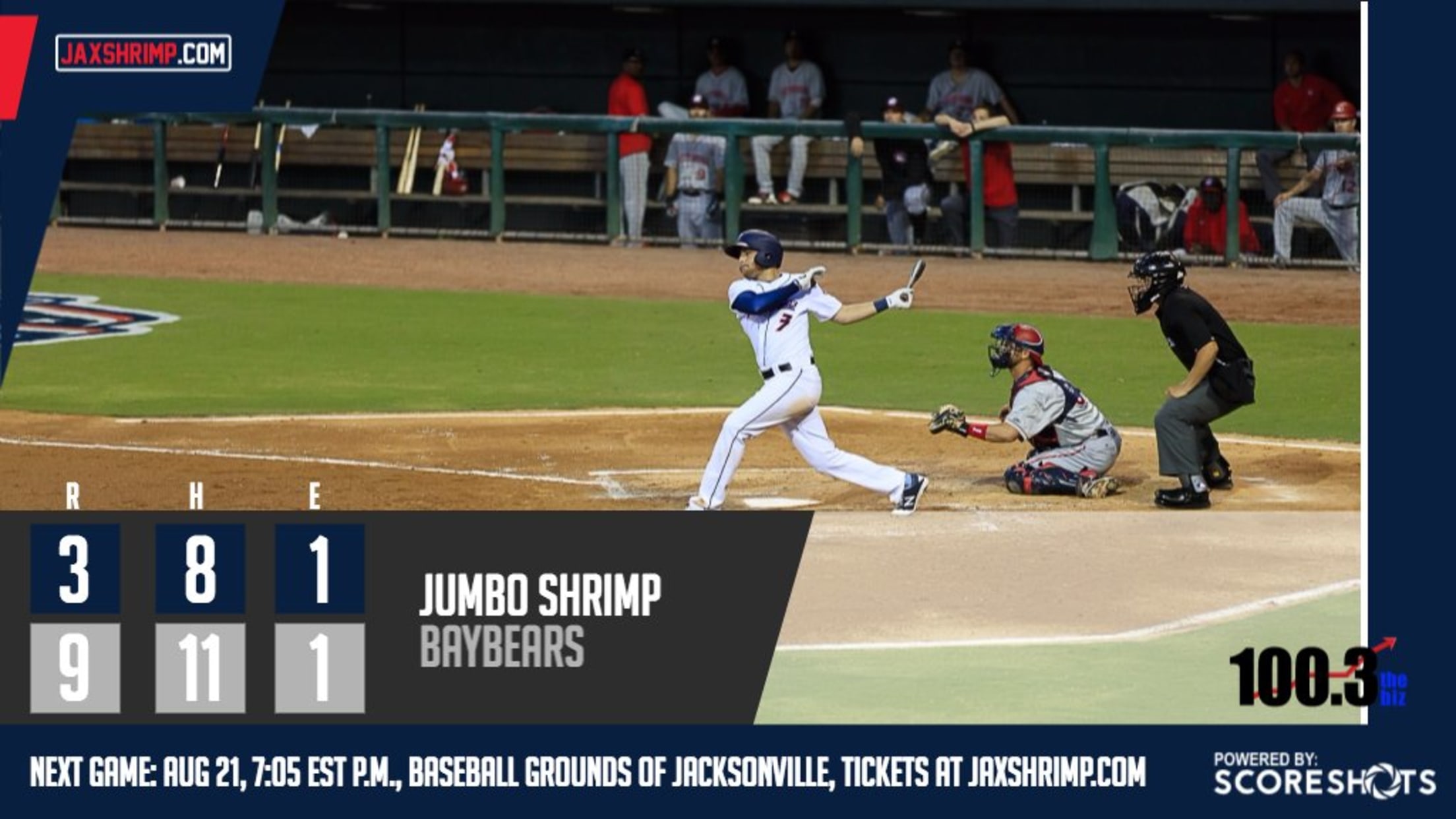 MOBILE, Ala. - The Jacksonville Jumbo Shrimp (28-26, 58-66) fell to the Mobile BayBears (28-27, 58-66) by a 9-3 score in the fifth and final game of the five-game series at Hank Aaron Stadium on Sunday evening.