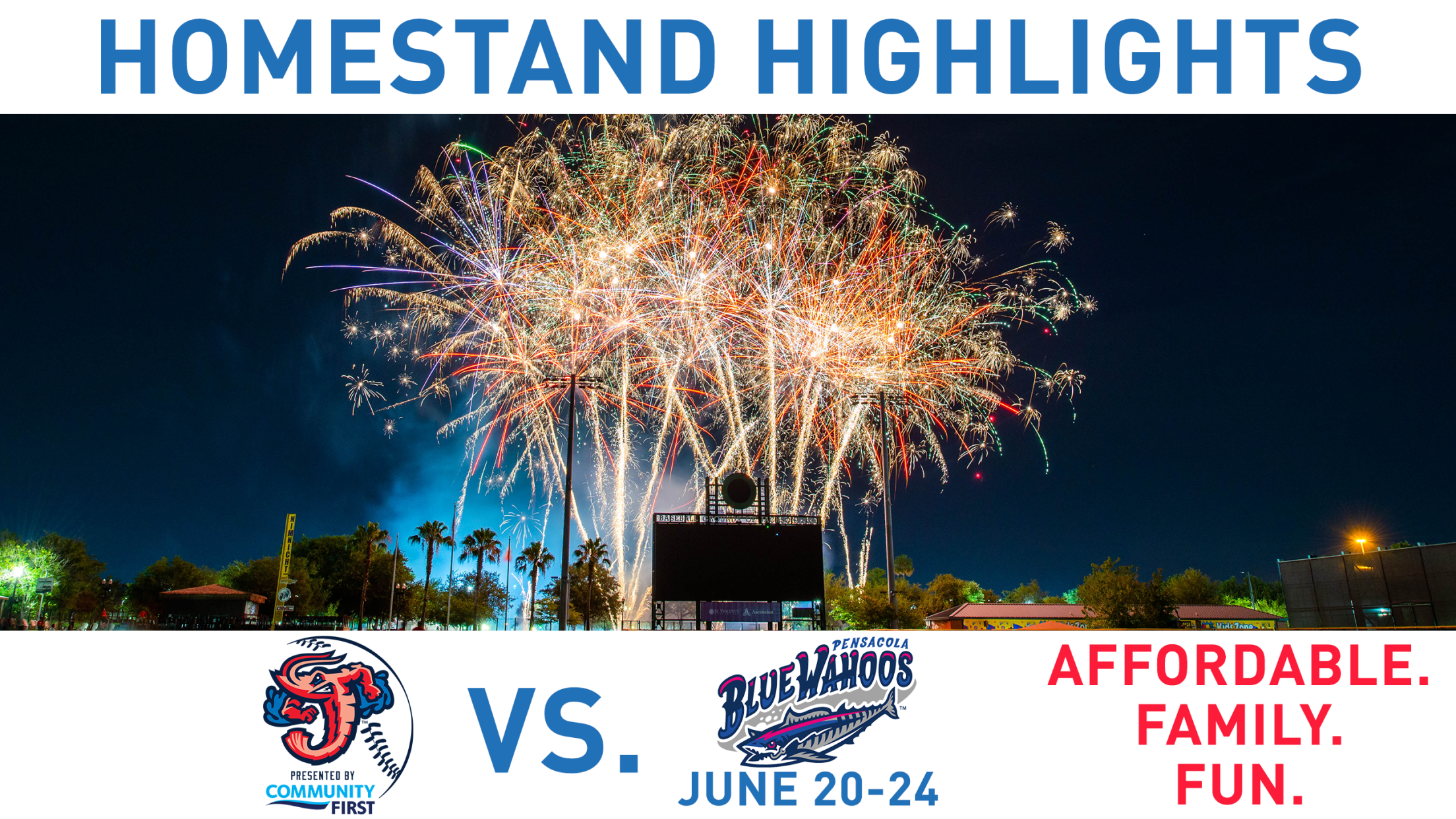 JACKSONVILLE, Fla. - The 2019 Jacksonville Jumbo Shrimp season presented by Community First Credit Union continues at 7:05 p.m. on Thursday, June 20 from the Baseball Grounds of Jacksonville. The Jumbo Shrimp will host the Pensacola Blue Wahoos, Double-A affiliate of the Minnesota Twins, for a five-game series from June 20 through Monday, June 24. The homestand features a promotional lineup that includes the following highlights: