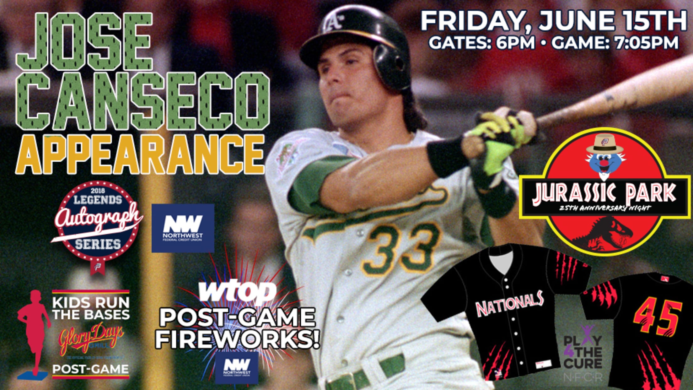 Jose Canseco to Appear at Northwest Federal Field at Pfitzner Stadium, P-Nats Set to Host Jurassic Park 25th Anniversary Night on Friday, June 15th