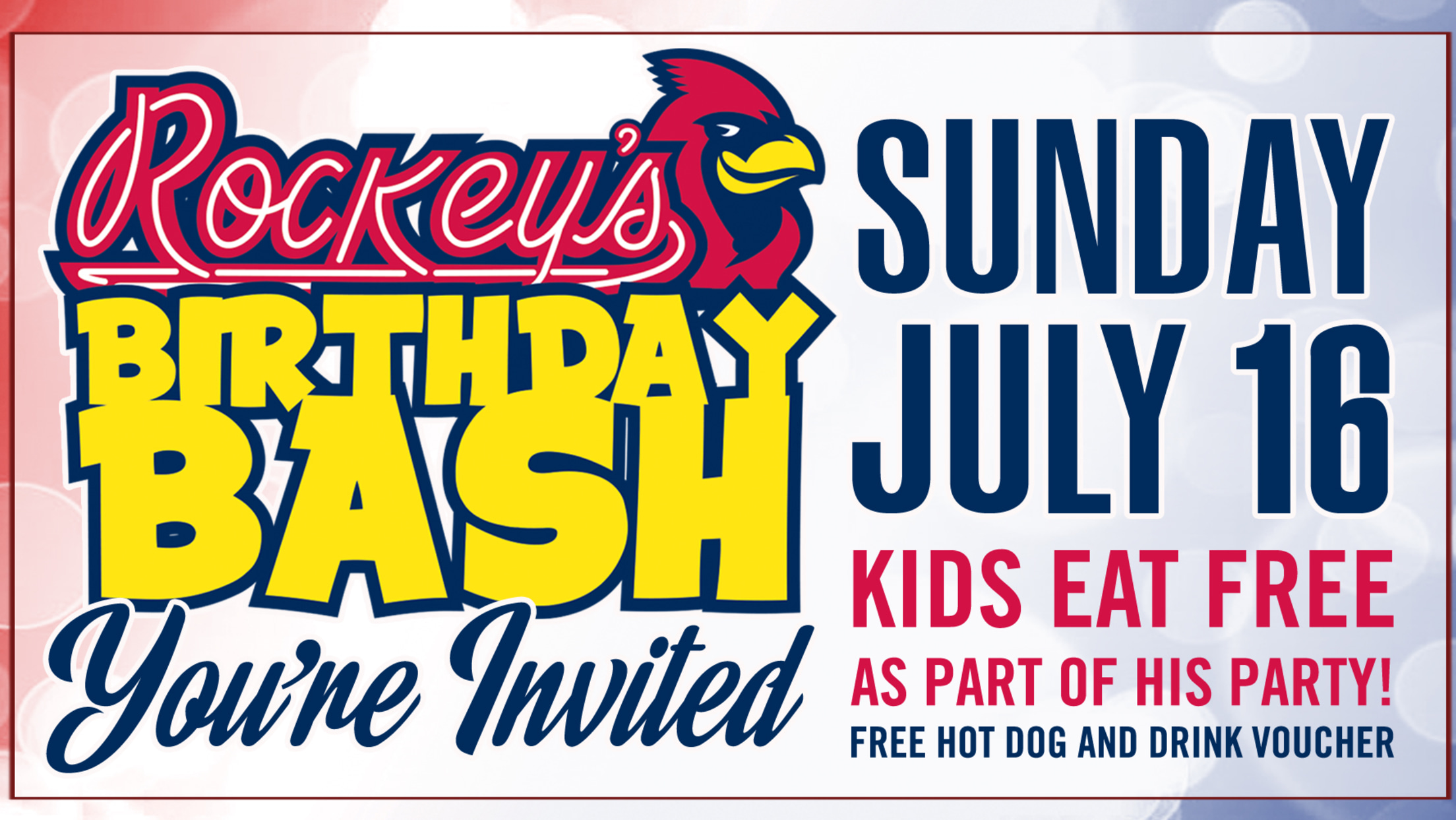Rockey's Birthday Celebration is Sunday, July 16, and kids eat free as part of his party! There will also be a face painter and other fun party games!