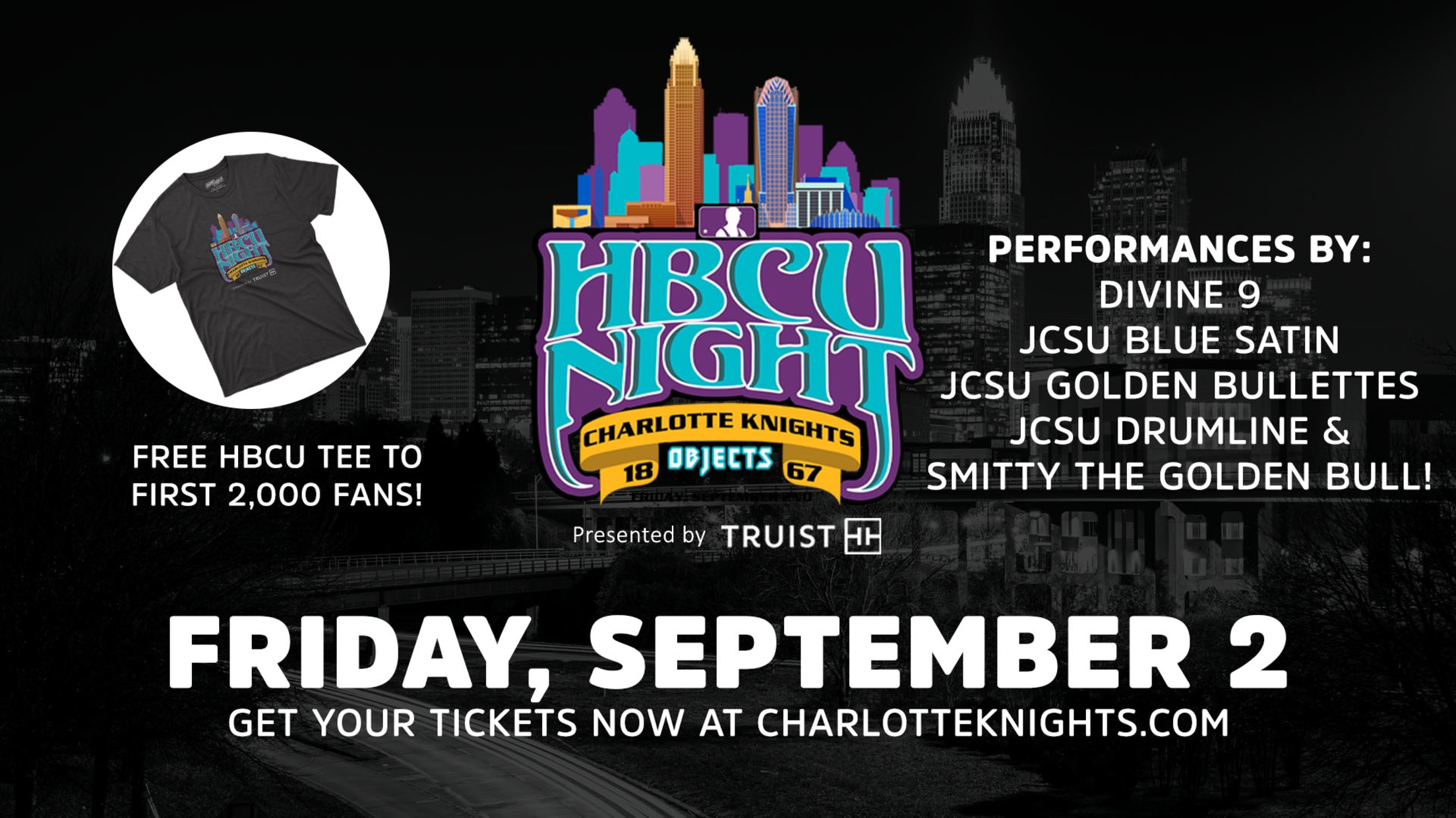 Throughout the night, fans can expect performances by Divine 9 from JCSU, as well as a special appearance from Smitty, JCSU’s beloved mascot. After the game, the JCSU Drumline will perform for fans on the field. Following the performance, the Knights will light up the Uptown Charlotte skyline with post-game fireworks presented by Truist and WBT Radio.