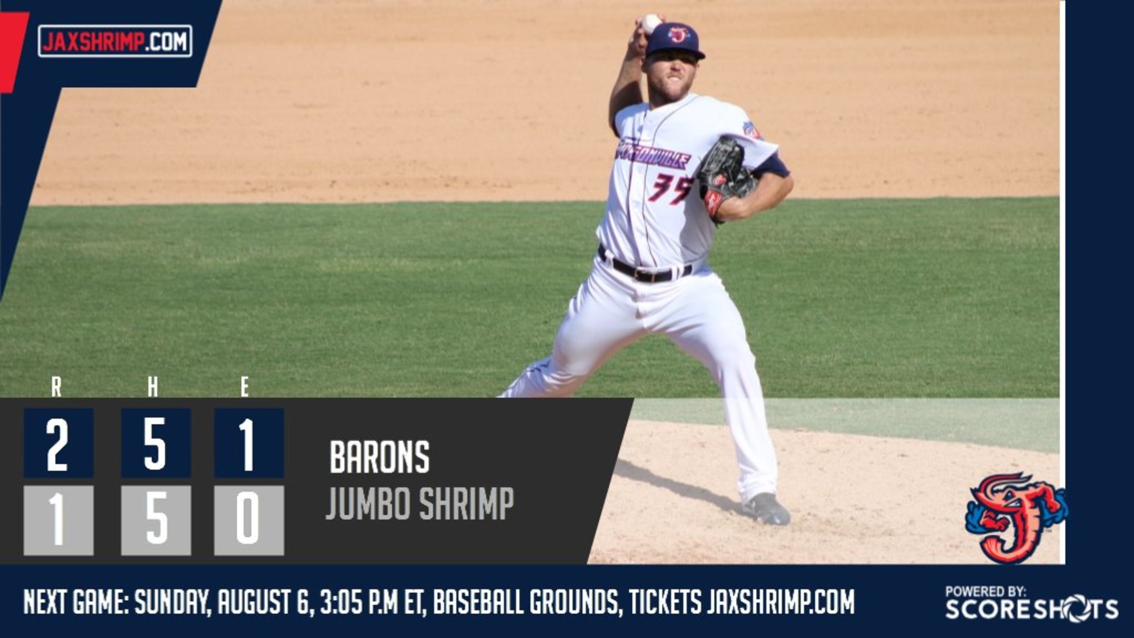 UP NEXT: The Jumbo Shrimp continue their series with Birmingham at 3:05 p.m. Sunday, when Jacksonville left-hander Dillon Peters (2-2) is scheduled to face Barons left-hander Jordan Guerrero (7-9). Gates open at 2 p.m. for Baptist Health Sunday Family FUNday, when families can play catch on the field before the game, and fans can visit a Jumbo Shrimp player autograph booth. After the game, kids 12 and under can run the bases. Free face painting, balloon animals, and kids crafts activities will be in the Wolfson Children's Hospital Kids Zone. On Superhero Weekend, the Jumbo Shrimp will wear Aquaman-themed jerseys that will be auctioned during the game to benefit the Baptist Health Foundation, for both Baptist Health and Wolfson Children's Hospital. Auction winners will go on the field after the game to receive the jerseys from the players. For Southpaw's Birthday, mascots Billy The Marlin, Jaxson DeVille, Chum, DJ The Dog and Mr. Biggs are gathering to celebrate Jacksonville baseball's top dog. The game is also presented by Channel 4 The Local Station.