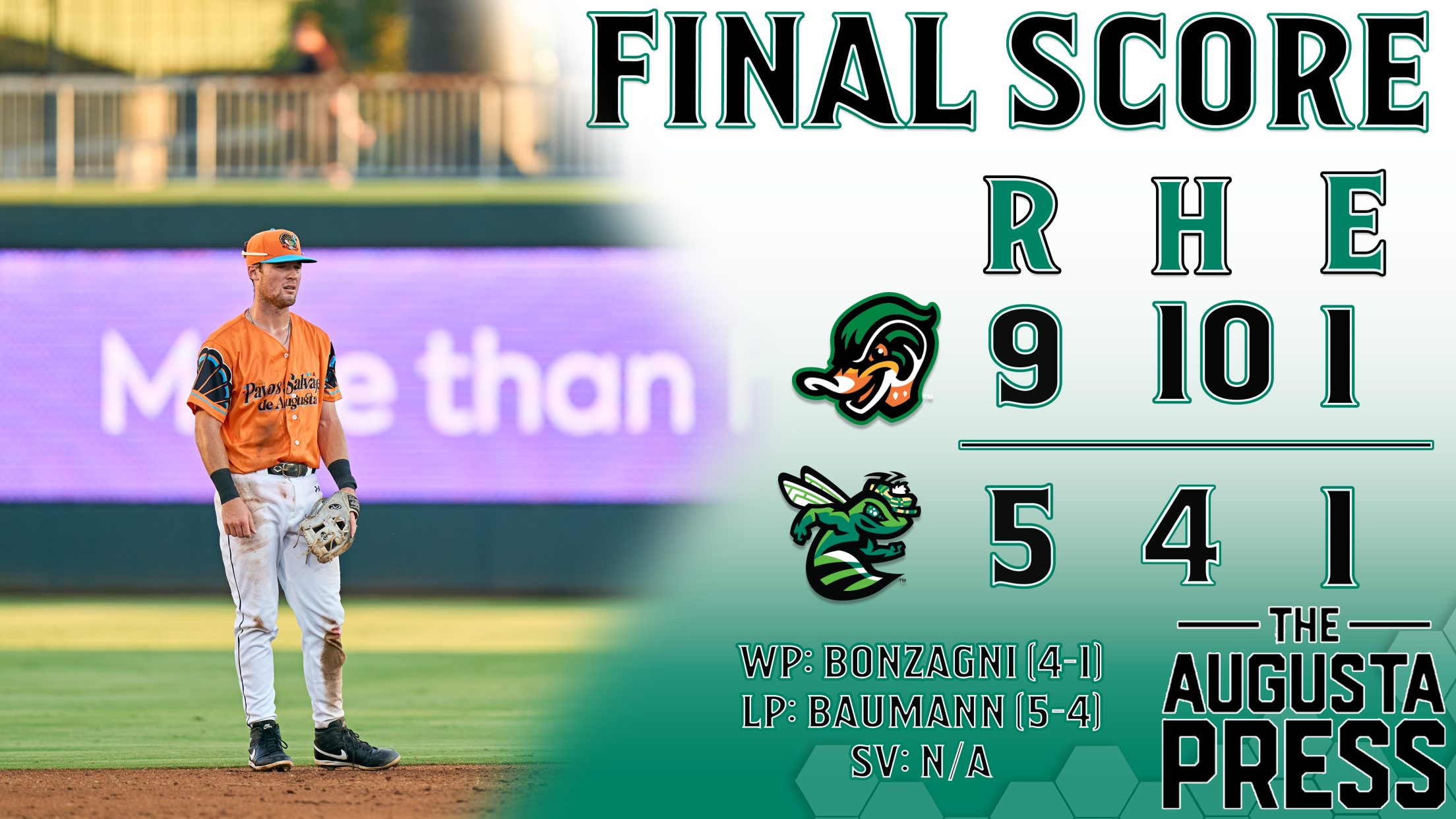NORTH AUGUSTA, SC: A four-run barrage in the bottom of the 8th gave hope to the home crowd and put the tying run in the on-deck circle, but the GreenJackets could not close an early gap and fell 9-5 against the Down East Wood Ducks in their first meeting of the year.