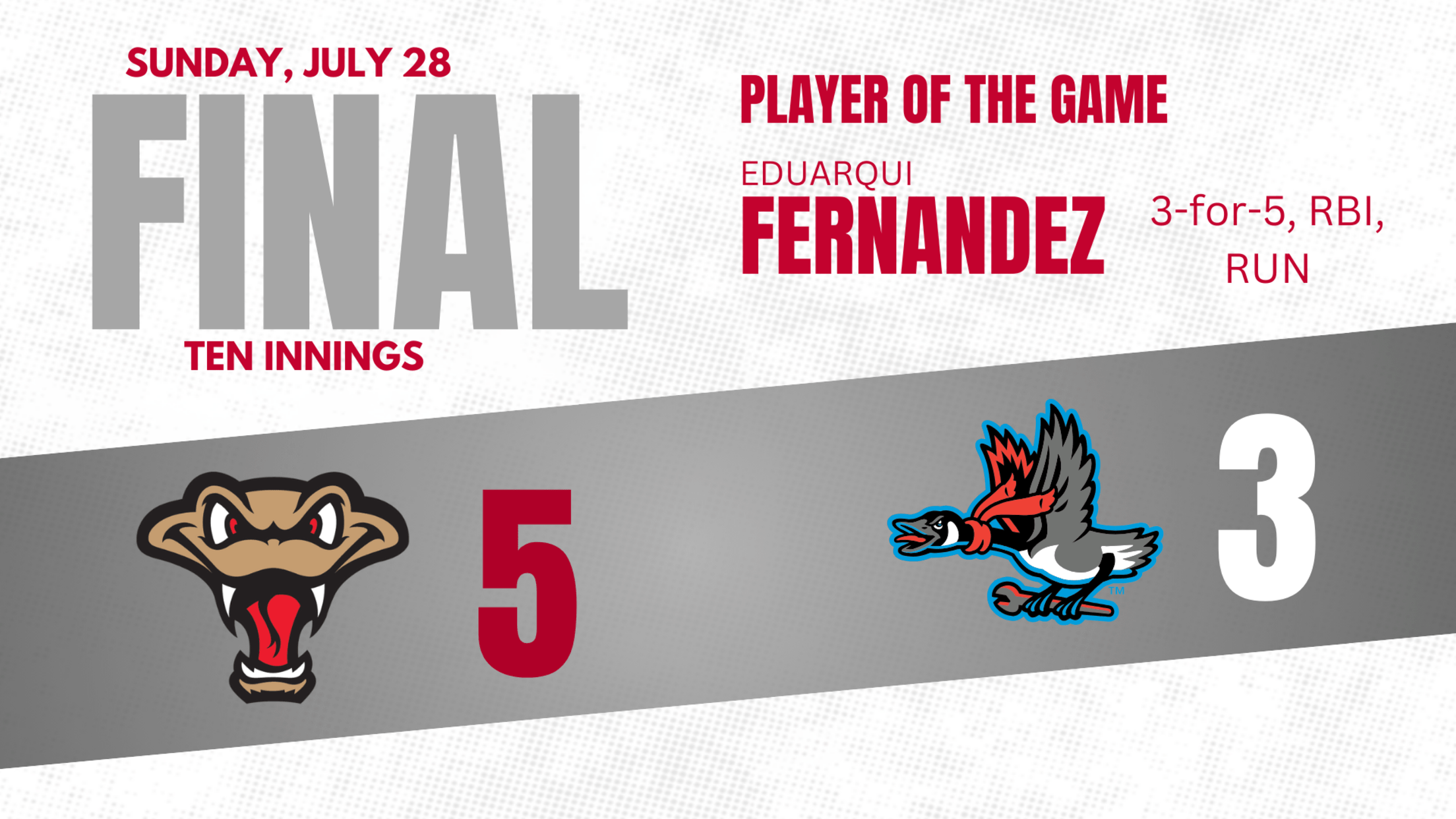 The Rattlers rallied in the top of the ninth to tie the game. Ramόn Rodríguez singled and Tayden Hall walked to start the inning against Evan Taylor. A wild pitch with one out moved both runners into scoring position. Fernández delivered a single to right to score Rodríguez with the tying run, but Hall was thrown out at the plate as he tried to score.