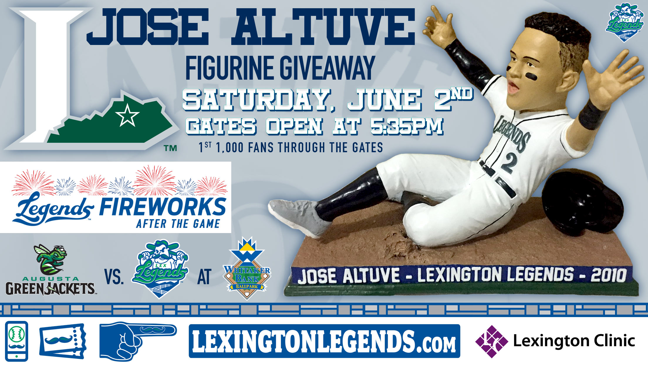 Saturday, June 2 at 6:35 p.m. vs. Augusta: The Legends will honor former second baseman Jose Altuve with his very own Throwback Figurine Giveaway on Saturday, June 2. The first 1,000 fans will receive the figurine when they enter through the gates of Whitaker Bank Ballpark at 5:35pm. Jose Altuve played in Lexington, KY the entire 2010 season where he was named the starting second baseman on the 2010 South Atlantic League Southern Division All-Star Team, and also named to the 2010 SAL Postseason All-Star Team as the second baseman. After gaining a promotion to Advanced-A with Lancaster to begin the 2011 season, he would again be promoted to Double-A Corpus Christi and on July 19, 2011, the Houston Astros called him up to make his MLB debut. After the conclusion of the 2017 season, the World Series Champion and former Legends player is now a 5x MLB All-Star, AL MVP, Gold Glove winner, AL Hank Aaron Award recipient, 4x Silver Slugger, 3x AL Batting Champion and 2x AL Stolen Base Leader. The game is sponsored by Lexington Clinic and stick around after the game for another fireworks show!