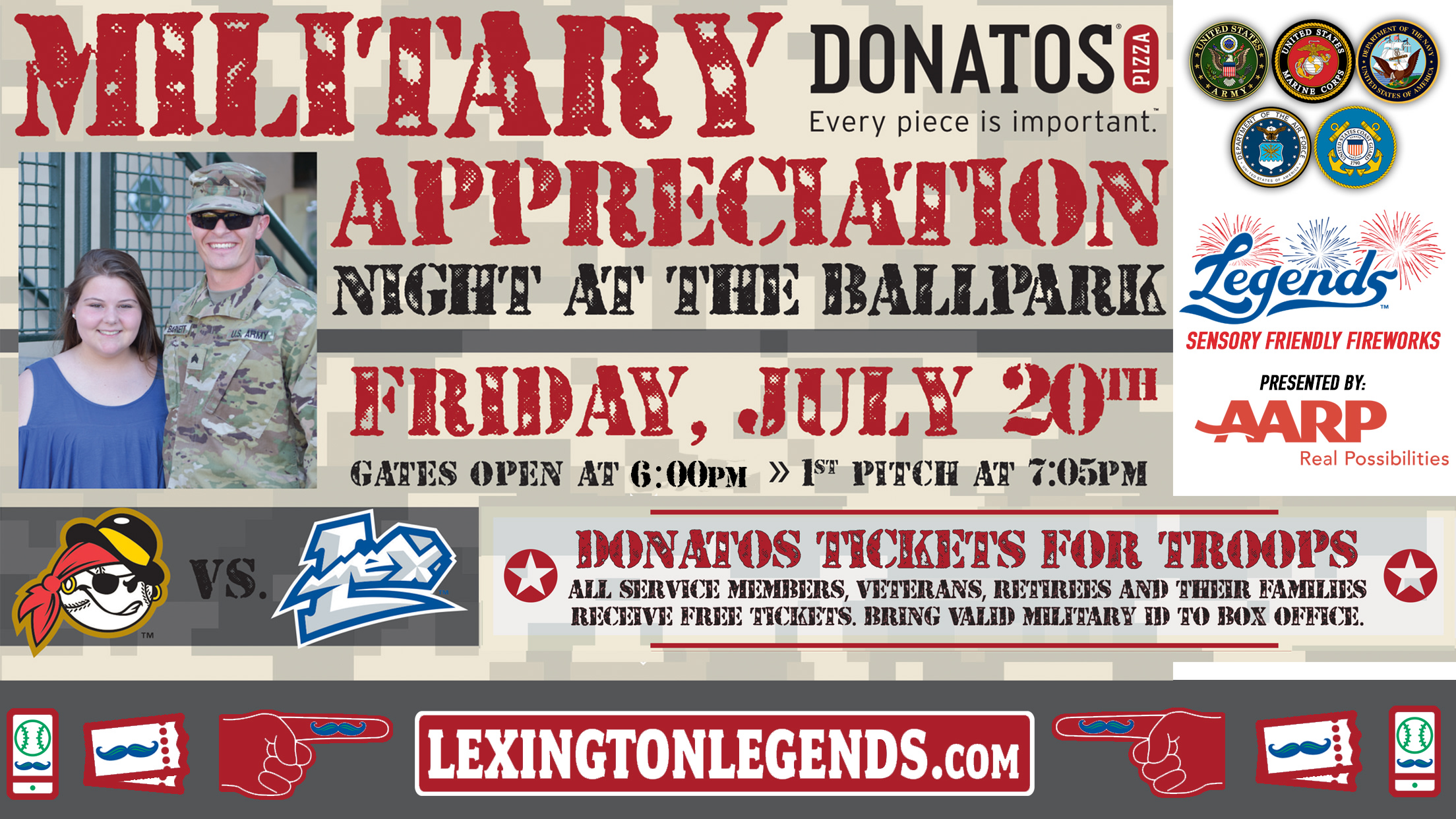 Friday, July 20 at 7:05 p.m. vs. West Virginia: Join us for a stachetastic day at Whitaker Bank Ballpark when we honor all branches of the United States Military on Military Appreciation Night. All service members, veterans, retirees and their families can present their valid military ID at the box office for free tickets for themselves and their family, courtesy of Donatos Tickets for Troops among other local businesses. When gates open at 6:05 p.m., fans can head down to the Bullpen Patio on the 1st base side to take in live music courtesy of a local musician for Friday Night Live. Following the game, the Legends will have sensory friendly fireworks, courtesy of AARP, that will not make loud noises like traditional fireworks shows.