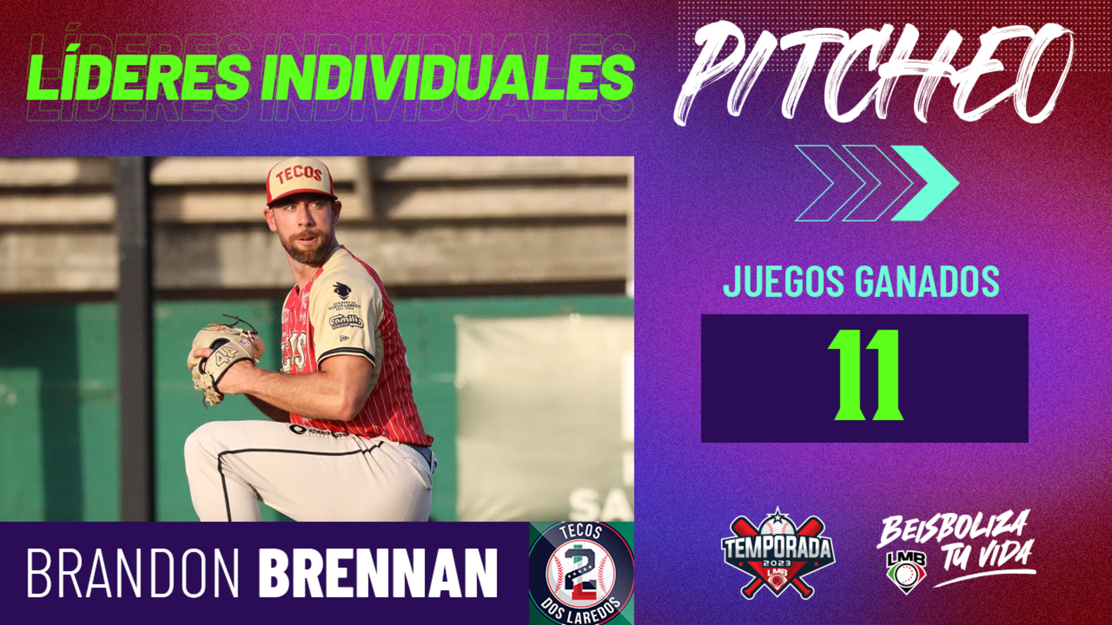 Ciudad de México (www.lmb.com.mx) 6 de agosto de 2023.- Brandon Brennan, de los Tecos de los Dos Laredos, y Yoimer Camacho, de los Pericos de Puebla, compartieron el liderato de victorias en la temporada 2023 de la Liga Mexicana de Beisbol con 11. Brandon Brennan, de 32 años y oriundo