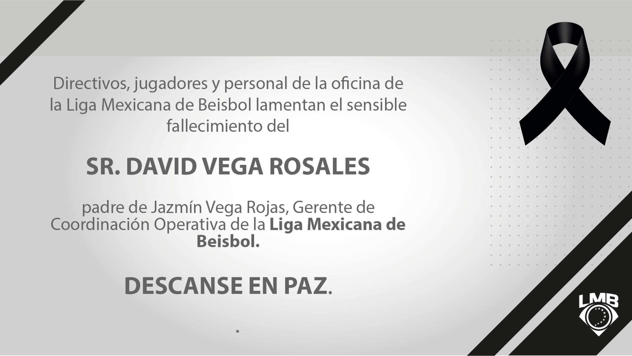 Ciudad de México (www.lmb.com.mx) 27 de abril de 2022.- Directivos, jugadores y personal de la oficina de la Liga Mexicana de Beisbol lamentan el sensible fallecimiento de DAVID VEGA ROSALES padre de Jazmín Vega Rojas, Gerente de Coordinación Operativa de la Liga Mexicana de Beisbol. DESCANSE EN PAZ.