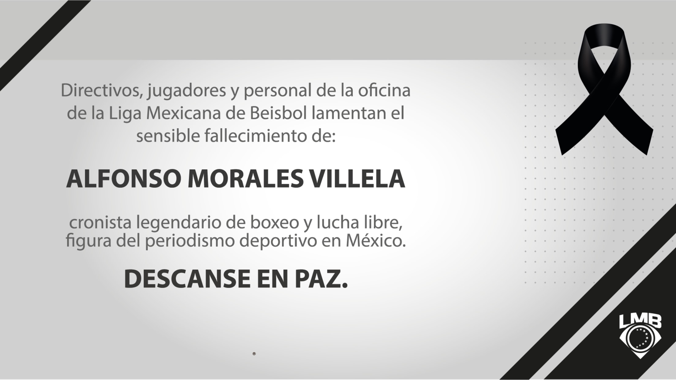 Ciudad de México (lmb.com.mx) 17 de diciembre.- Directivos, jugadores y personal de la oficina de la LMB envían sus condolencias por el sensible fallecimiento de: Alfonso Morales Villela figura emblemática del periodismo deportivo mexicano. Extendemos nuestras condolencias a familiares y amigos, deseándoles una pronta resignación. Descanse en Paz.