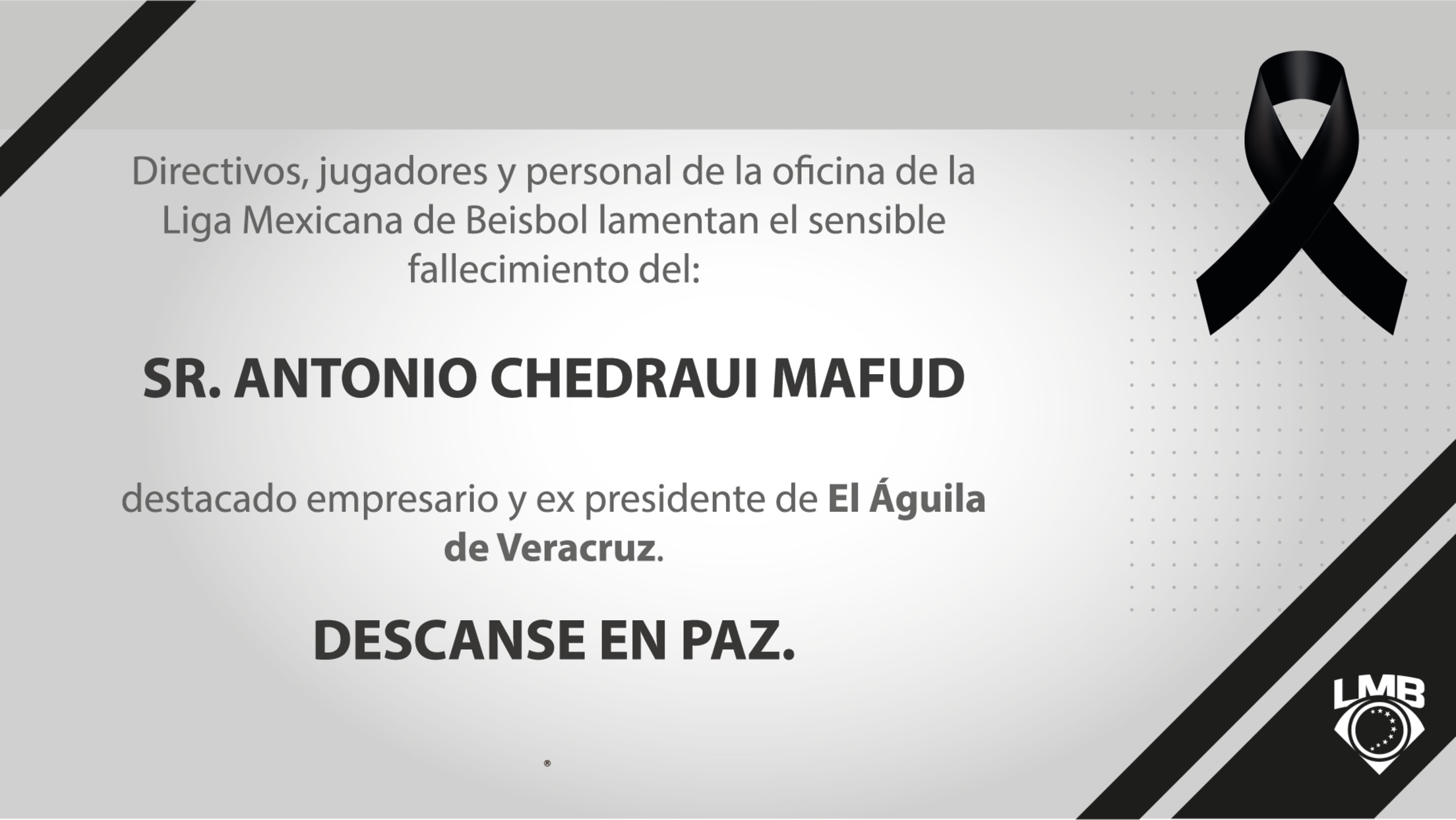 Ciudad de México (www.lmb.com.mx) 10 de marzo de 2023.- Directivos, jugadores y personal de la oficina de la Liga Mexicana de Beisbol, y de los 18 clubes que la componen, lamentamos el fallecimiento del Sr. Antonio Chedraui Mafud quien fuera un destacado empresario veracruzano y ex presidente de El Águila