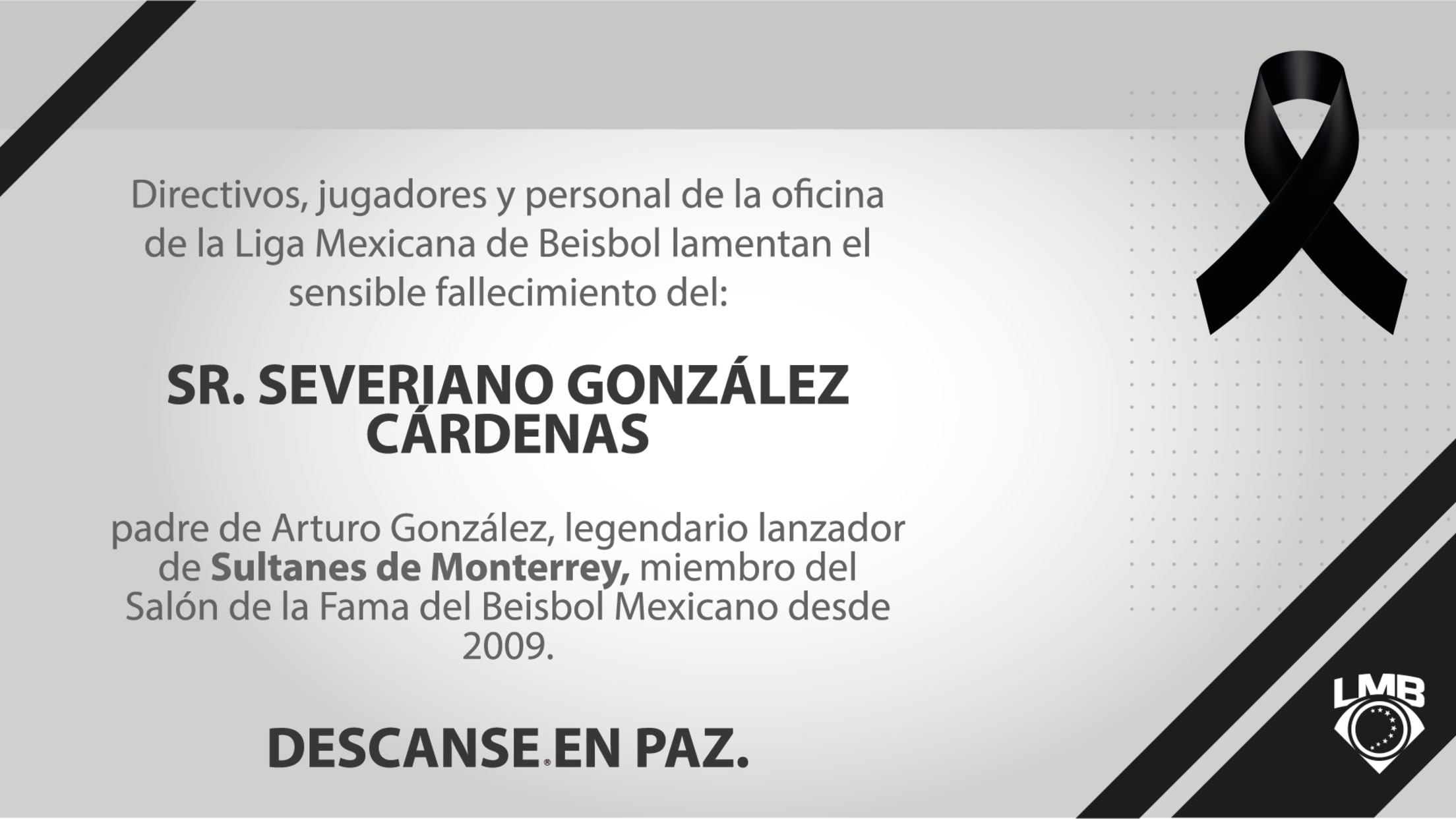 Ciudad de México (lmb.com.mx) 14 de diciembre.- Directivos, jugadores y personal de la oficina de la LMB envían sus condolencias a la familia González Cárdenas por el sensible fallecimiento del: Sr. Severiano González Cárdenas padre de Arturo González, legendario lanzador de Sultanes de Monterrey, miembro del Salón de la Fama