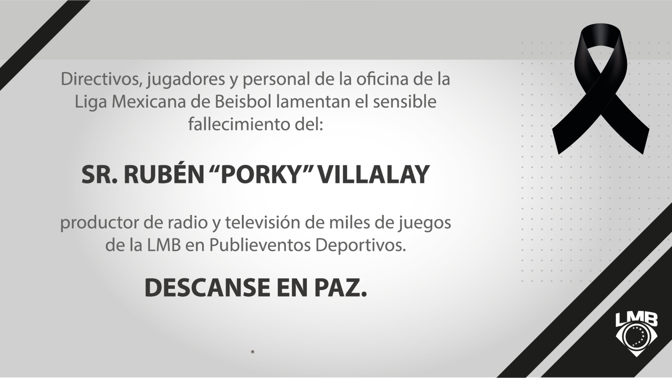 Ciudad de México (www.lmb.com.mx) 20 de febrero de 2023.- Directivos, jugadores y personal de la oficina de la Liga Mexicana de Beisbol, y de los 18 clubes que la componen, lamentamos el fallecimiento de Rubén Moreno Villalay El popular "Porky" Villalay nació en Ciudad Juárez, Chihuahua, el 16 de enero