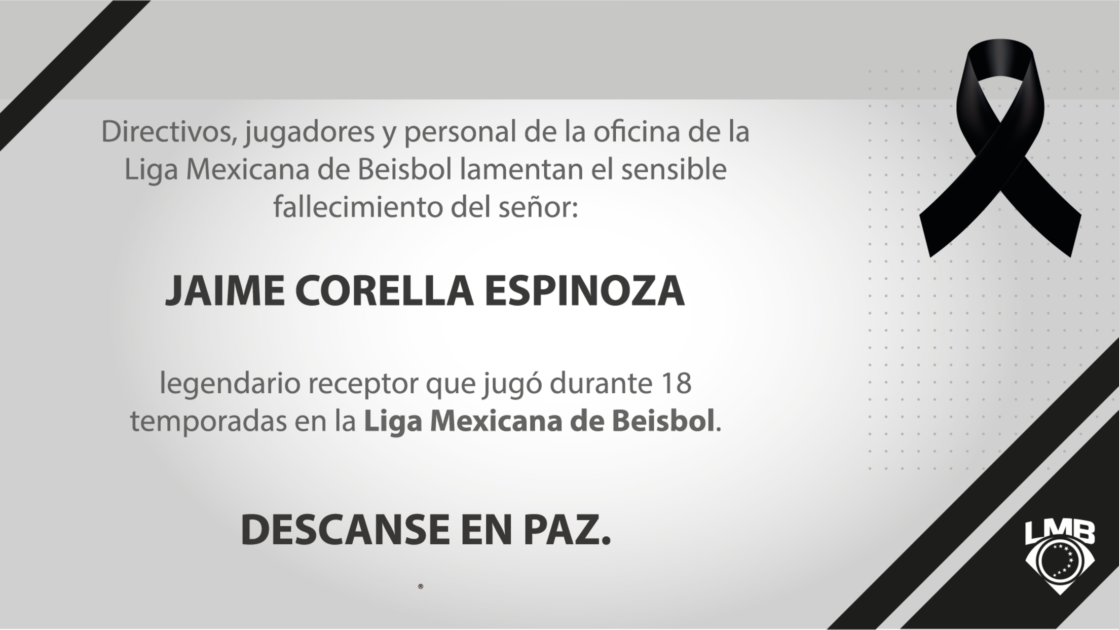 Ciudad de México (www.lmb.com.mx) 25 de septiembre de 2023.- Nos unimos a la pena que embarga a familiares y amigos de Jaime Corella, receptor que brilló durante 18 temporadas en los diamantes de la Liga Mexicana de Beisbol.