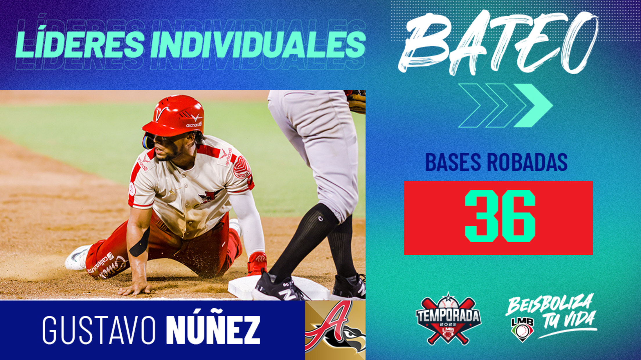 Gustavo Núñez, de 35 años y oriundo de San Pedro de Macorís, República Dominicana, se convierte en el sexto pelotero en la historia de El Águila de Veracruz en liderar la Liga Mexicana de Beisbol en bases robadas. Antes lo consiguieron Aldo Salvent (22 en 1956), Osmond Walker (37 en 1959), Marcelo Juárez (43 en 1968), Erick Bullock (46 en 1994) y Jeremías Pineda (60 en 2015).