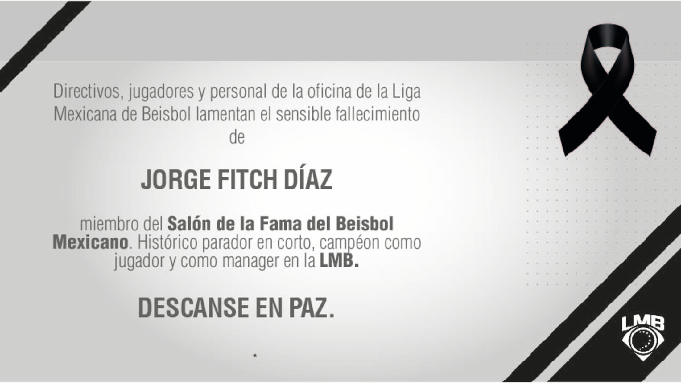 Ciudad de México (www.lmb.com.mx) 15 de abril de 2021.- Directivos, jugadores y personal de oficina de la Liga Mexicana de Beisbol y de los 18 clubes que la componen, lamentamos el fallecimiento de Jorge Fitch.