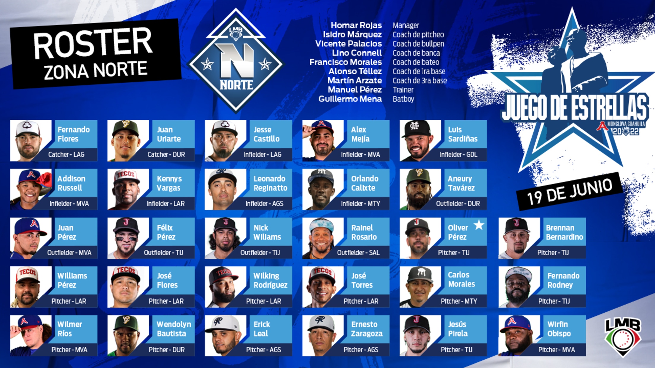 Ciudad de México (www.lmb.com.mx) 13 de junio de 2022.- El roster de la Zona Norte para el Juego de Estrellas 2022 se apuntaló con las incorporaciones de los lanzadores Wirfin Obispo, de Acereros de Monclova, y de Williams Pérez, de Tecolotes de los Dos Laredos.