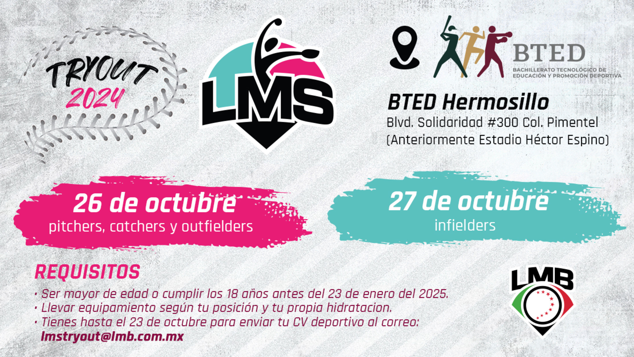 Ciudad de México (www.lmb.com.mx) 8 de octubre de 2024.- La segunda temporada de la Liga Mexicana de Softbol se acerca y la LMS busca más talento. El Tryout 2024 de la LMS se llevará a cabo en Hermosillo, Sonora, el próximo 26 y 27 de octubre. La sede será el